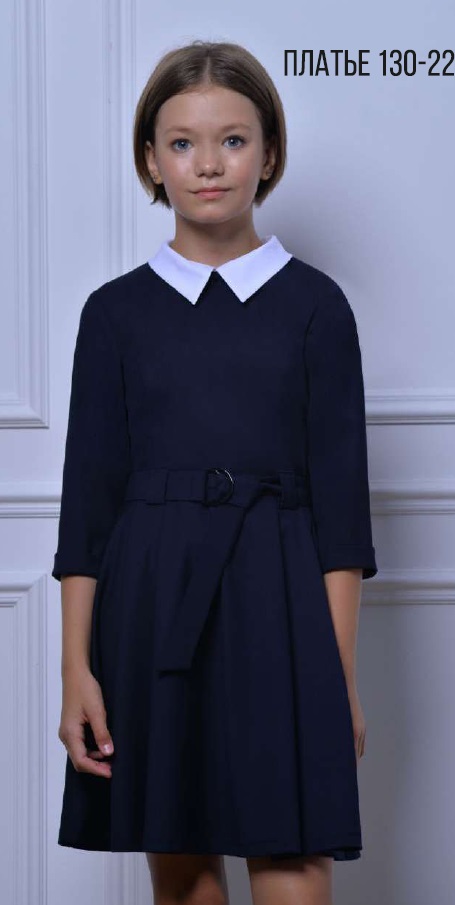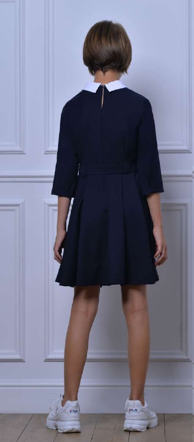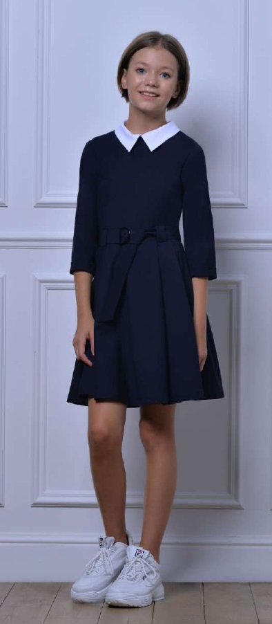 Платье для девочки отрезное по линии талии. Рукав 3/4. Юбка расклешенная в складку. Шлевки. Ремень из основной ткани, в комплекте. Воротник съемный. Модель выполнена из ткани габардин.