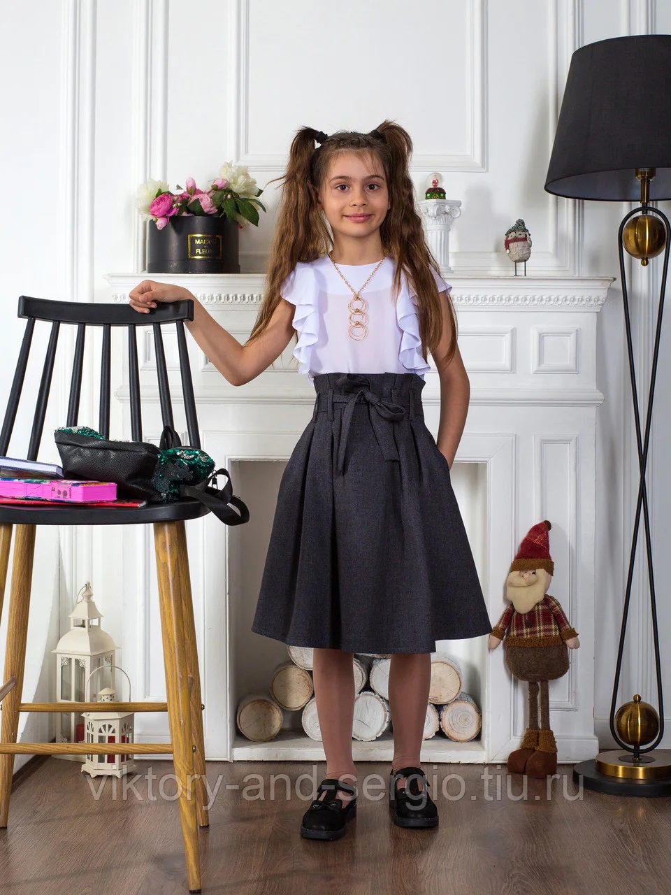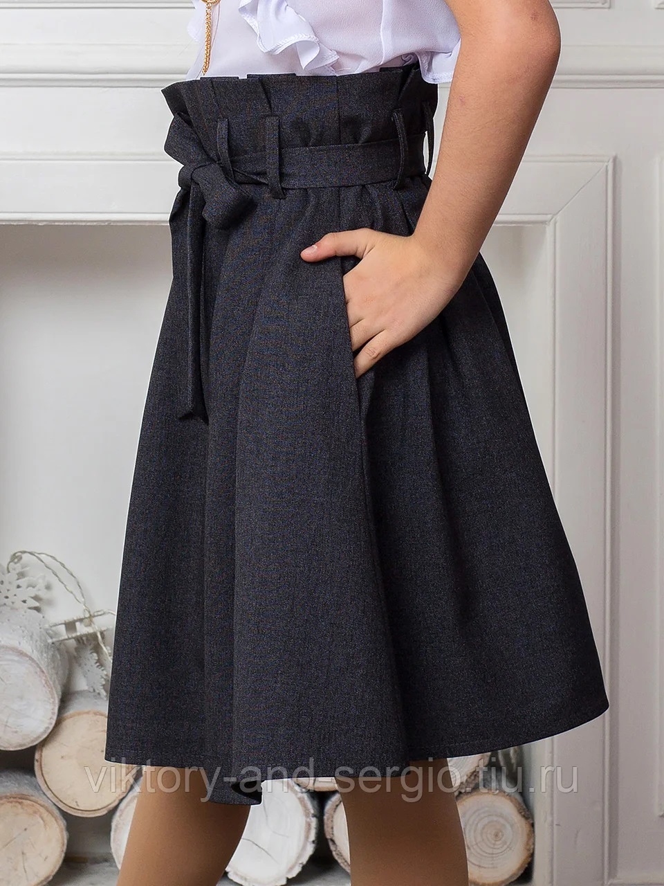 Юбка средней длины с боковыми карманами, глубокими защипами имеет более расширенную линию талии и вполне подойдет девочкам средней полноты.