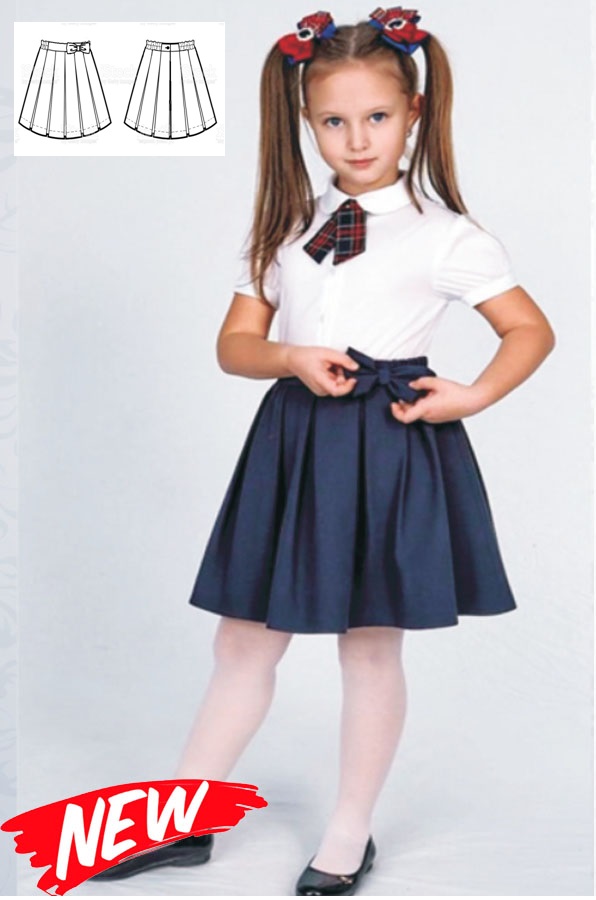 "Юбка с 12 бантовыми складками, на поясе с застежкой на петлю и пуговицу. Переднее полотнище цельное, заднее - из двух частей. В среднем шве заднего полотнища – потайная молния. Пояс цельный, на боковых участках резинка. На поясе с левой стороны переднего полотнища бант, вставленный в шлевку.