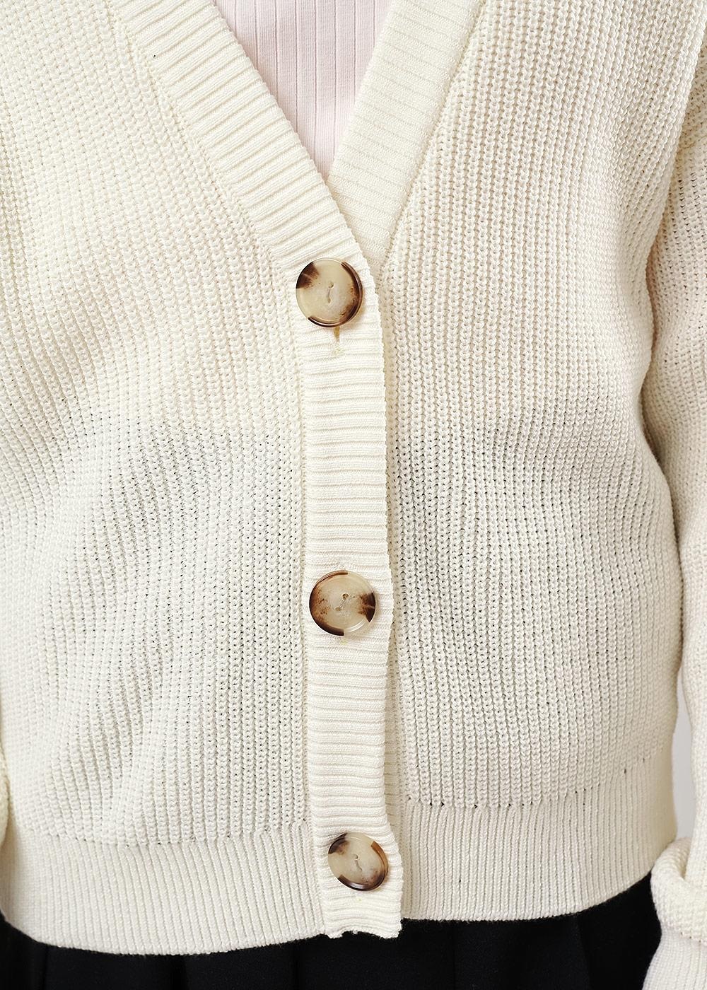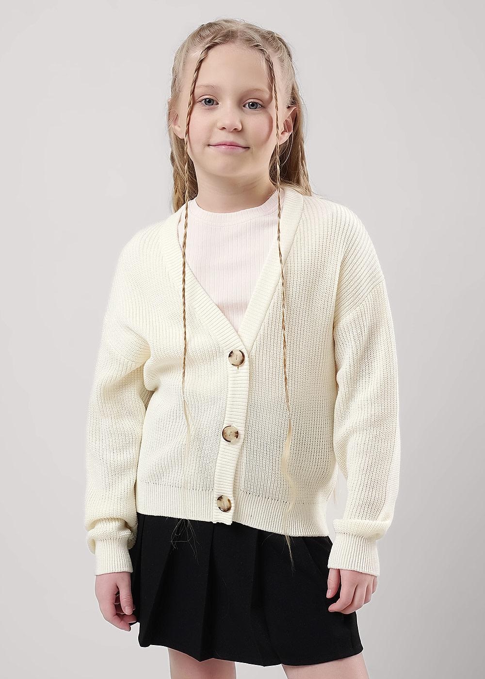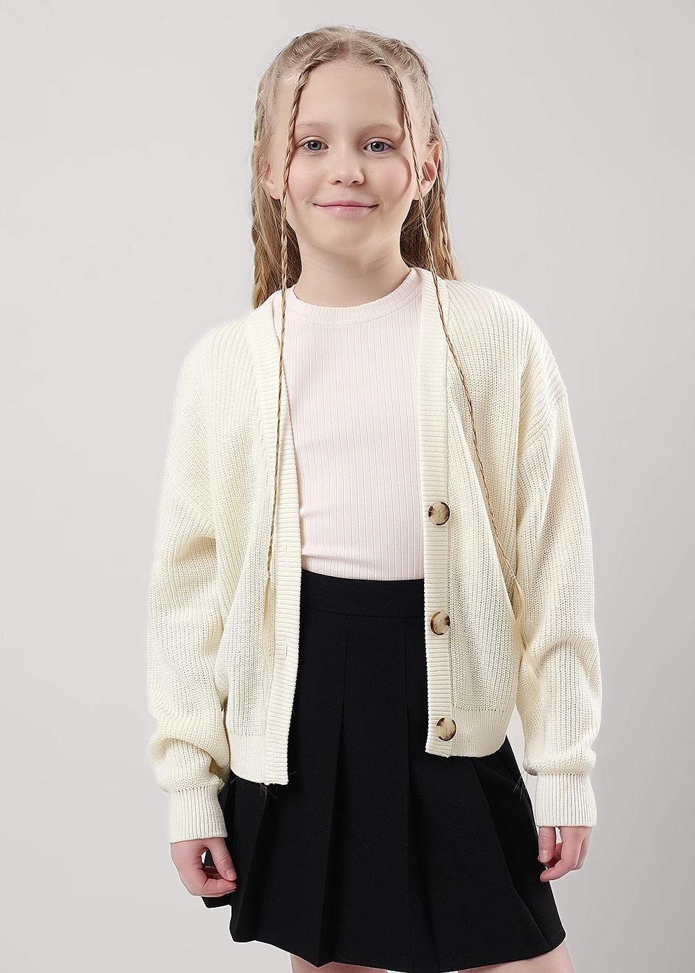 Стильный укороченный кардиган из хлопка с добавлением акрила. Трендовые оттенки, свободный силуэт, спущенная линия плеча, застежка на пуговицы. По горловине, низу рукавов и изделия эластичная вязка.