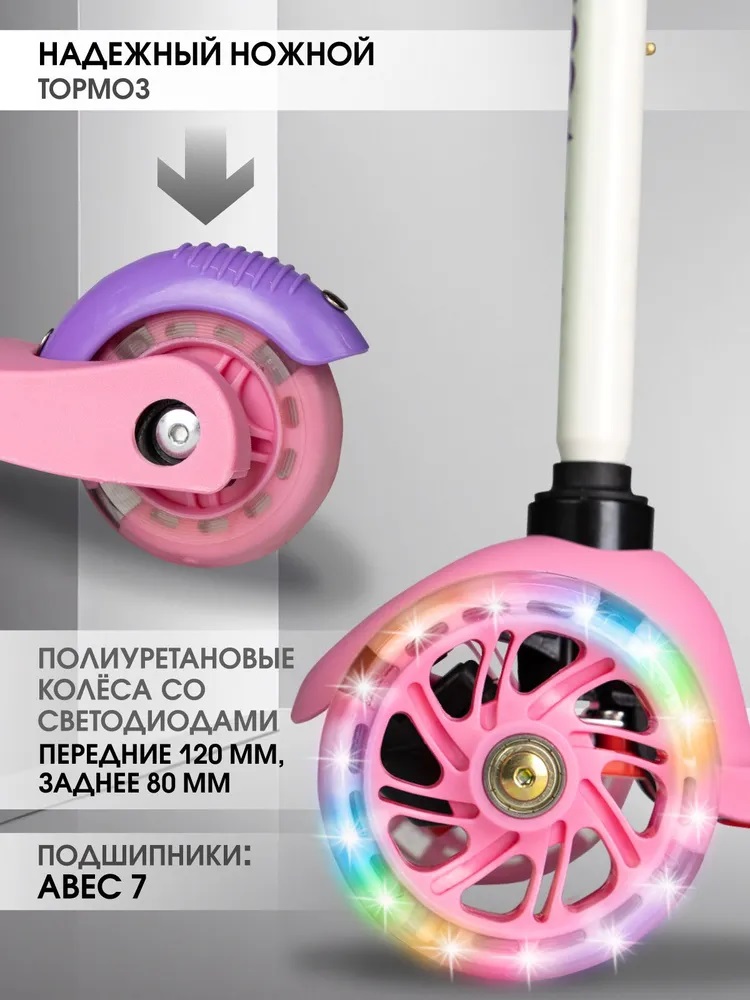 Имеется надежный ножной тормоз. детский самокат трехколесный для детей яркий стильный шустрый, самокат трехколесный для мальчика для девочки.