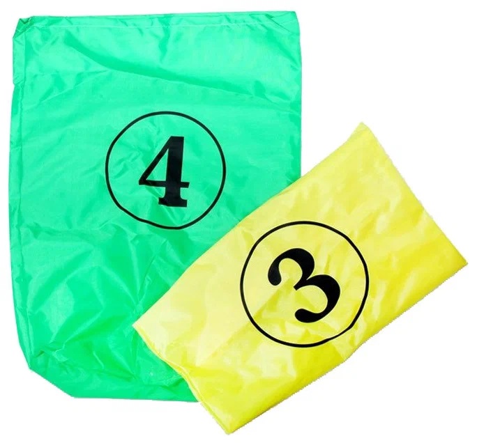 В комплекте находится два тканевых мешка, зеленого и желтого цвета, украшенных цифрами 3 и 4.