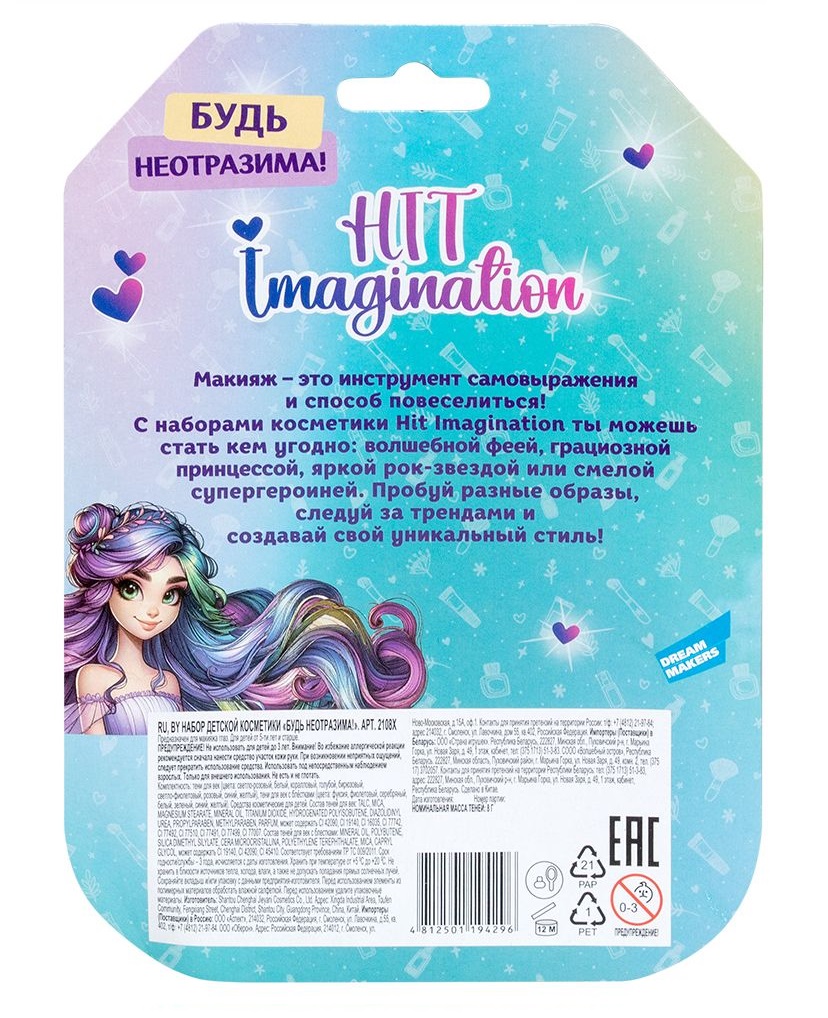 Подарите своей маленькой принцессе набор детской косметики «Будь неотразима!» 2108X и откройте для нее мир ярких образов! Этот набор содержит богатую палитру из 16 оттенков теней для век – 9 матовых и 7 мерцающих с блестками. С помощью набора девочка сможет экспериментировать с макияжем глаз, создавая уникальные и неповторимые луки. Набор идеально подходит для игр в "преображение" и развития творческих способностей. Помните, что использование косметики детьми должно происходить под наблюдением взрослых. Макияж – это прекрасный инструмент для самовыражения, а с наборами Hit Imagination каждая девочка сможет почувствовать себя настоящей звездой!