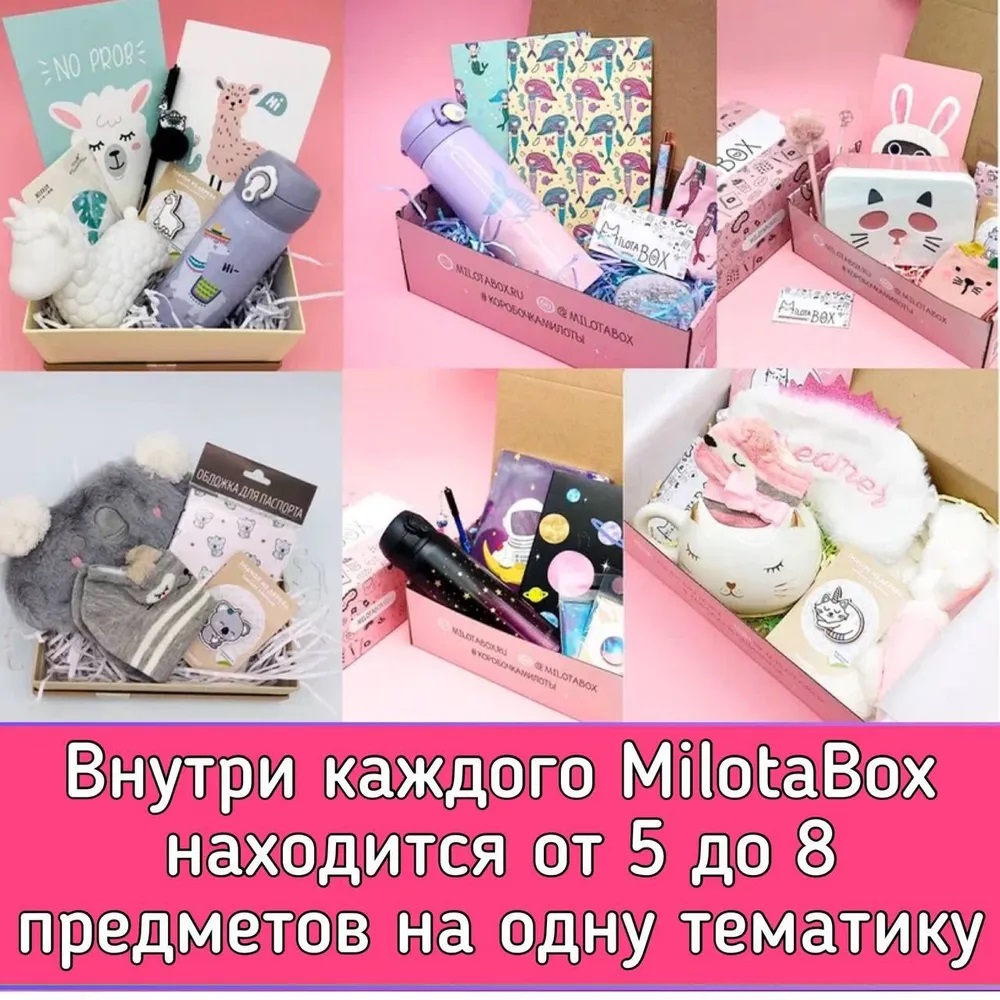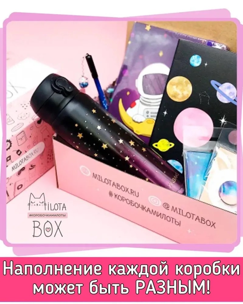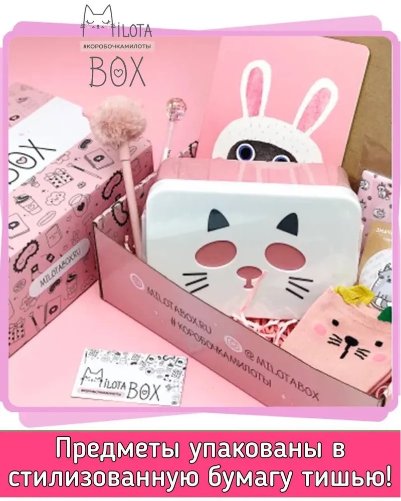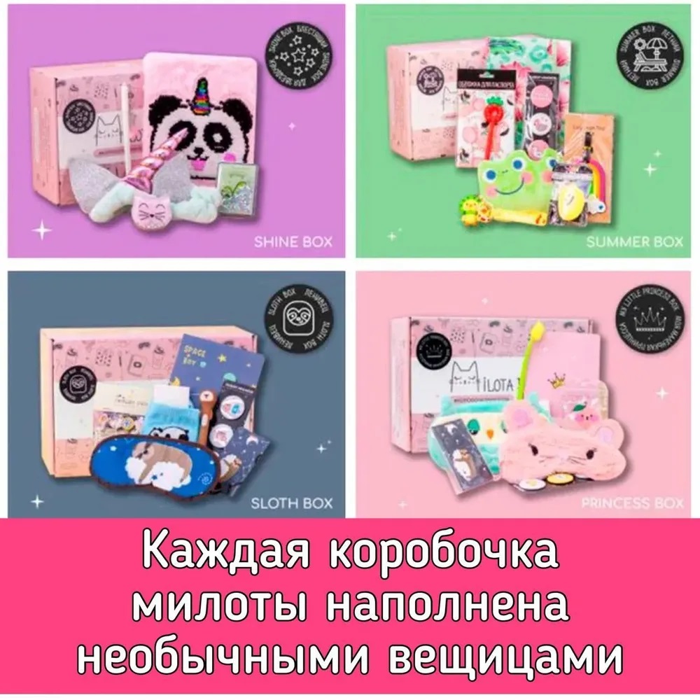 - каждая коробочка милоты наполнена необычными вещицами, которыми будет приятно пользоваться в повседневной жизни: милая канцелярия, уютные товары для дома, стильные аксессуары, предметы для здорового образа жизни и приятные мелочи;