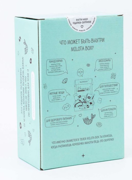 Milota Box мини - это оригинальный подарок, сюрприз, который вызовет массу эмоций- удивление, восторг и радость. Подарочный набор состоит из 4-8 предметов, объединенных в соответствии с тематикой. Количество предметов милоты бокс зависит от стоимости каждого товара. Маленькая коробка для подарка может включает в себя: милую канцелярию, уютные товары для дома и интерьера, стильные аксессуары, предметы для здорового образа жизни, товары для путешествий и приятные мелочи. От серии к серии наполнение меняется, поэтому можно собрать целую коллекцию сюрпризных боксов. Бокс с подарками приятно преподнести на праздник: выпускной, 8 марта, Новый год, день рождения, день святого Валентина или просто без повода девочке, дочке, подруге, сестре, девушке, маме, любимой, коллеге. Главное определится с понравившейся тематикой: лама, собачка, лисичка, панда, единорог, кот, фламинго, школьный, авокадо, для путешествий, а остальное мы возьмем на себя. Упаковочная коробка выполнена из плотного картона, размер 22 х 14 х 9 см.