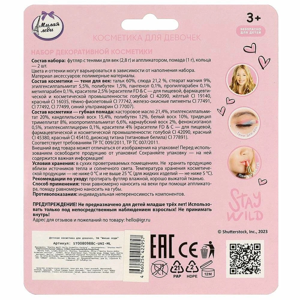 Девочки в любом возрасте хотят быть красивыми. Специально для юных модниц был разработан этот набор, состоящий из теней для век, помады для губ и стильных аксессуаров. Маленькая принцесса обязательно оценит красочные цвета и модную упаковку. Развивайте чувство стиля и вкуса, учите девочку создавать свой неповторимый образ вместе с косметикой ТМ «Милая леди».