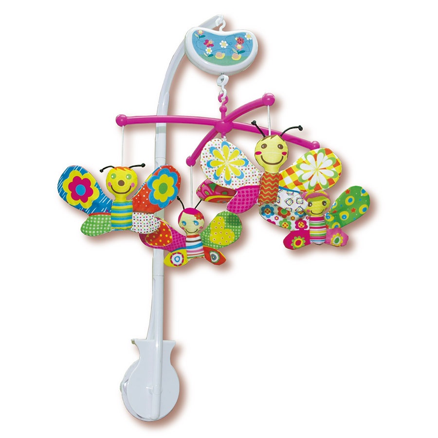 Музыкальный мобиль с яркими и мягкими набивными игрушками-бабочками;