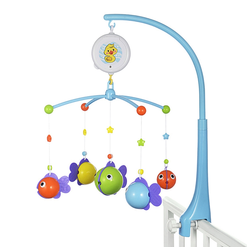 Этот музыкальный мобиль станет одной из первых игрушек малыша. Сначала кроха будет фокусировать взгляд на ярких забавных рыбках.