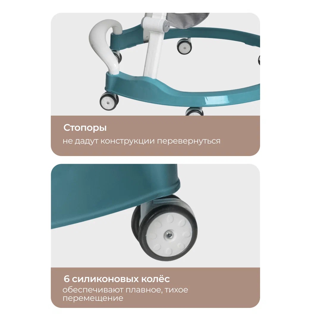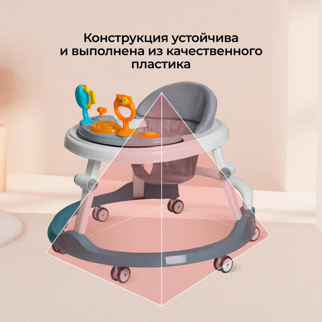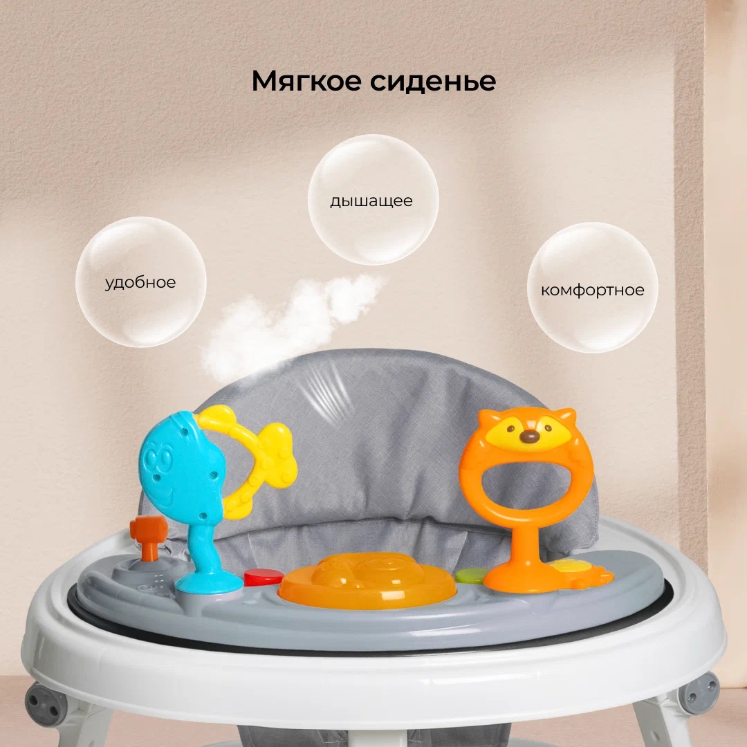 Материал сиденья мягкий, приятный на ощупь и съёмный. 6 беcшумных колёс из материала PU  позволят беспрепятственно перемещаться малышу в ходунках.