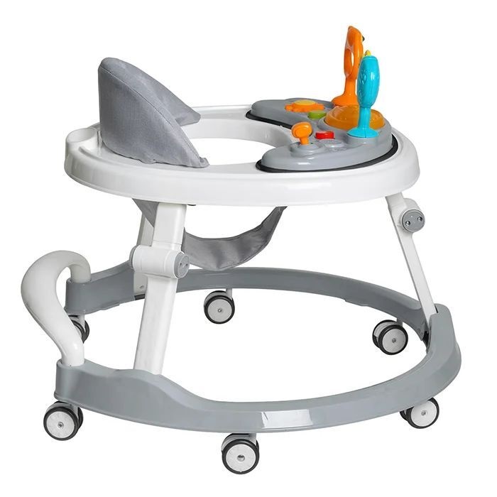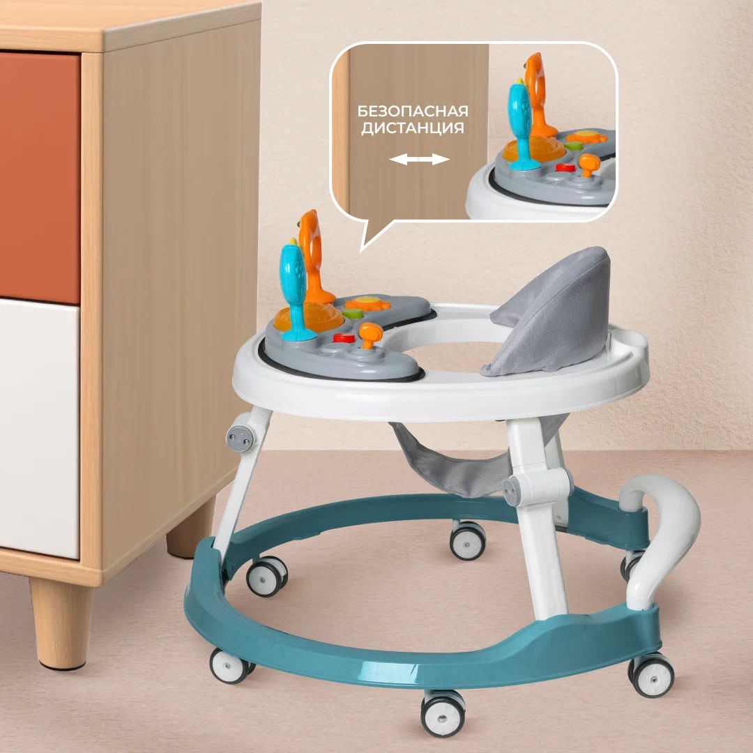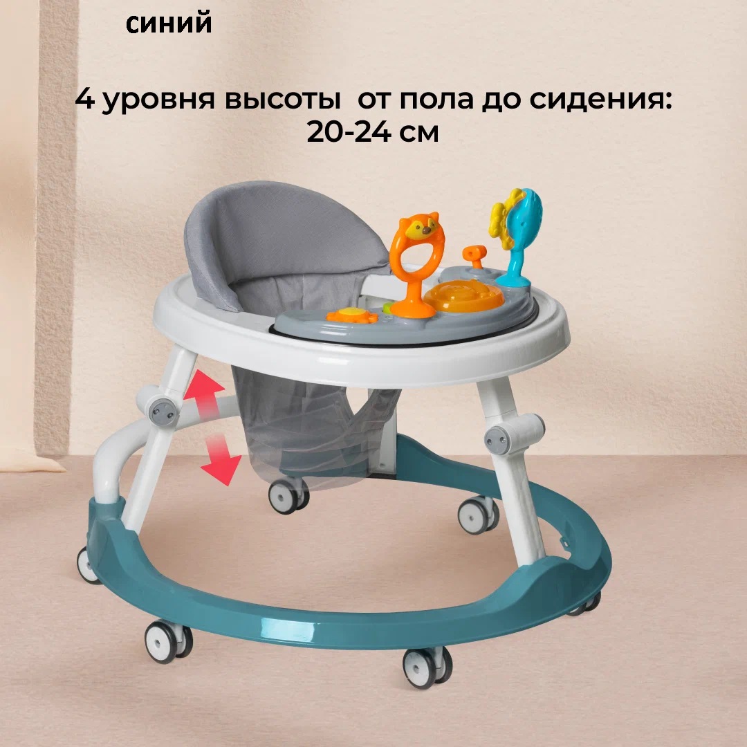 Материал сиденья мягкий, приятный на ощупь и съёмный. 6 беcшумных колёс из материала PU  позволят беспрепятственно перемещаться малышу в ходунках.
