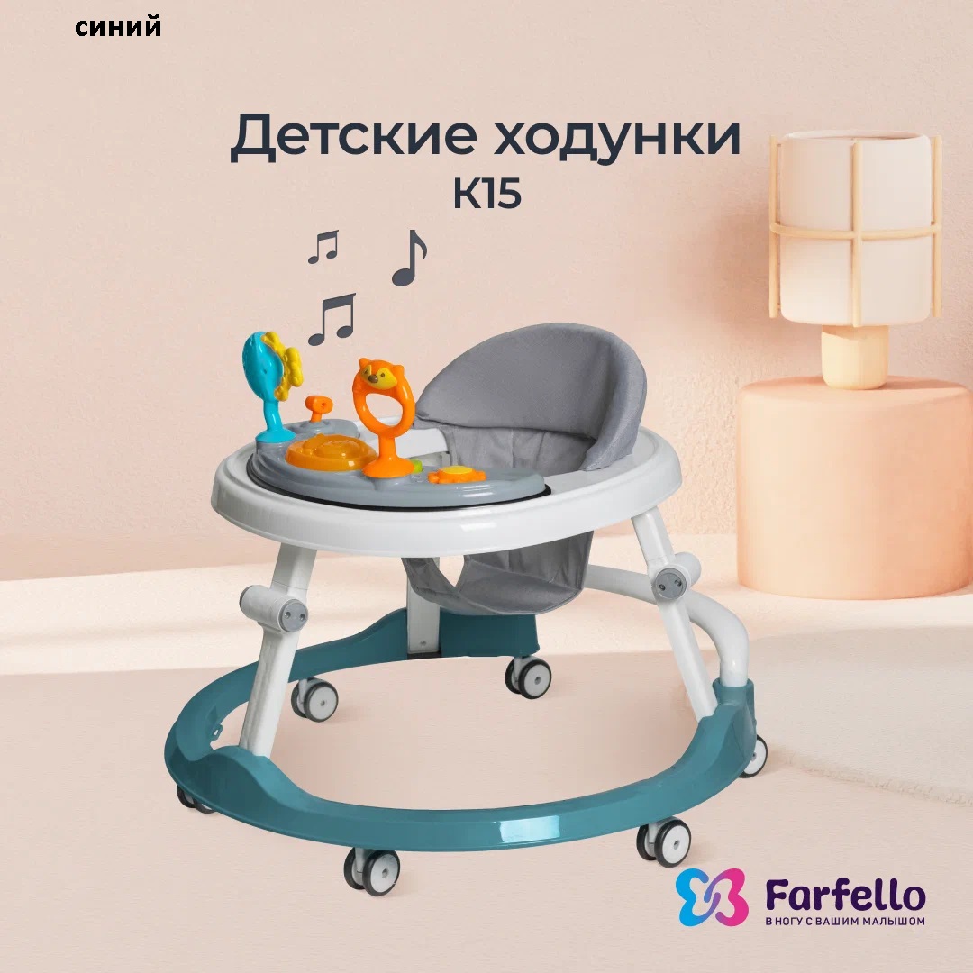 Интересные ходунки для детей Farfello К15 с музыкальной панелью понравятся малышам и их родителям. В ходунках малыши научатся держать равновесие и координировать движения. Свето-музыкальная панель привлечет внимание ребенка яркими огоньками и весёлыми мелодиями. Сиденье для ребенка регулируется по высоте в четырех положениях, позволяет выбрать нужный вариант под рост мальша. Высота регулируется с помощью металлической втулки, которая вставляется в одну из 4-х секций в разделителе между ног. Для компактного хранения ходунки собираются легко с помощью 3 пластиковых суставов, расположенных на корпусе.