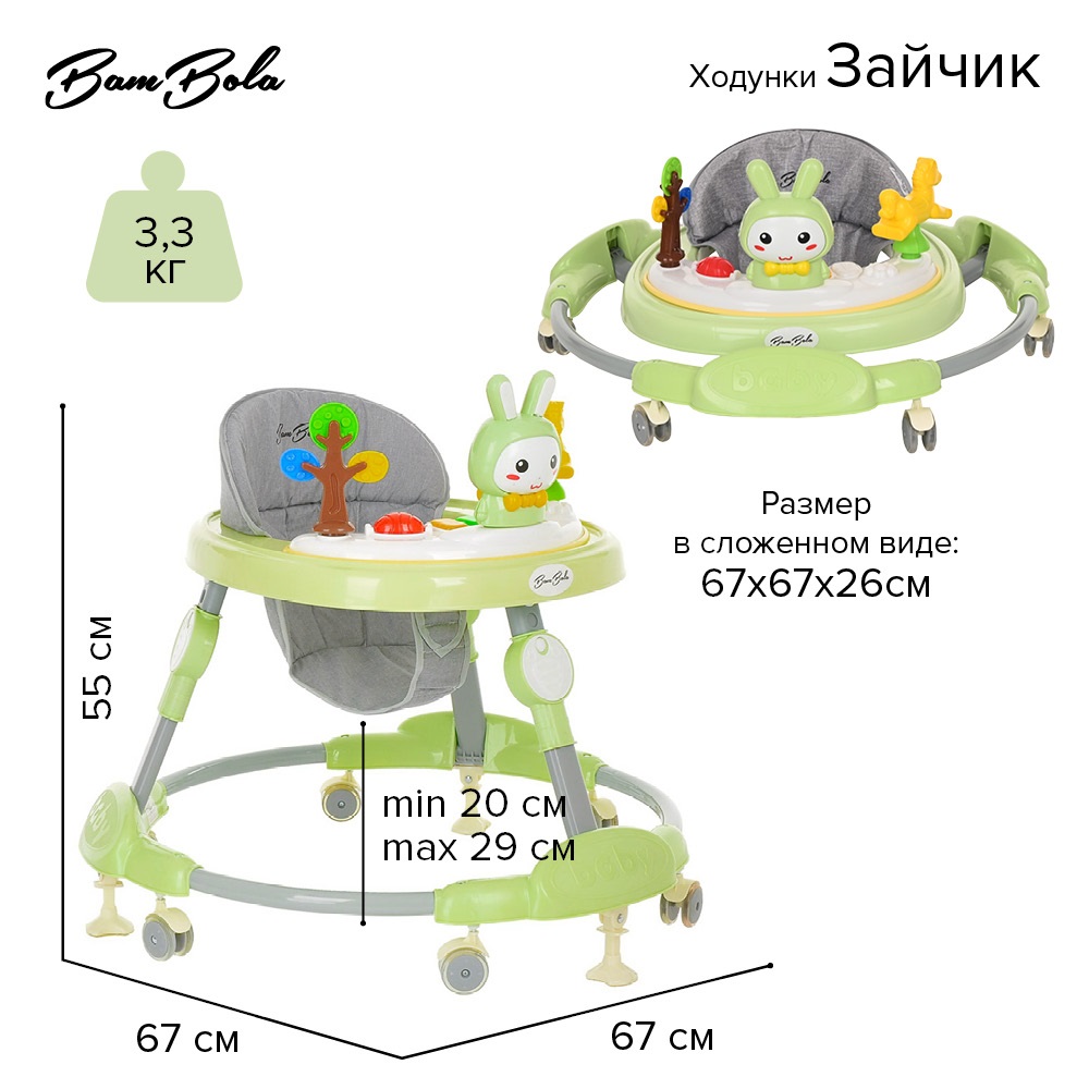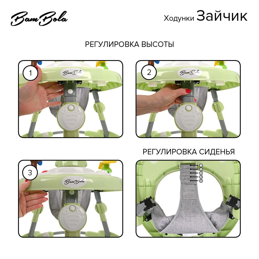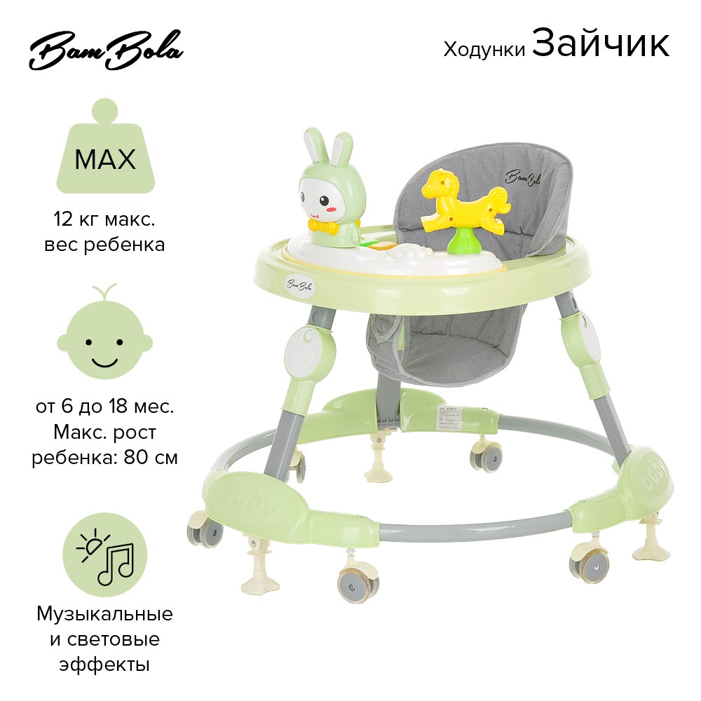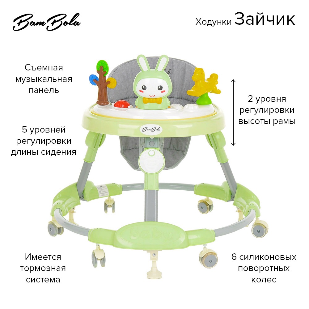 Ходунки Bambola Зайчик подготовят малыша к первым самостоятельным шагам, развивают координацию движений и помогают ребенку научиться держать равновесие. Имеют съемную музыкальную игровую панель со световыми и звуковыми эффектами. Мягкое, удобное сиденье. Ходунки легко регулируются в зависимости от роста ребенка.