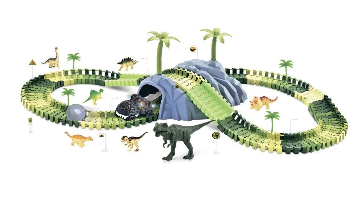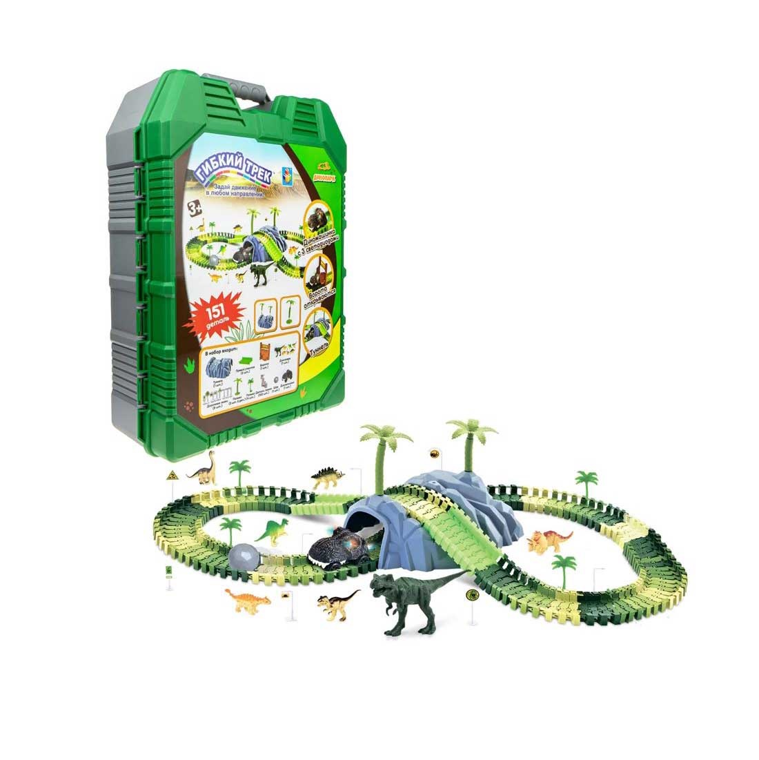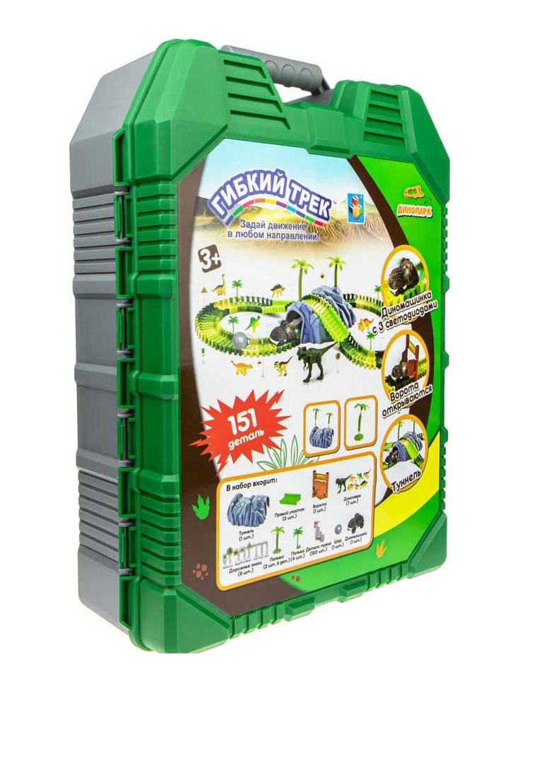 Игрушка Гибкий трек Динопарк 151 деталь 1toy Т20861. Наборы серии Гибкий трек задают новый тренд традиционной игре с машинками. Дорогу можно не просто собрать так, чтобы она поворачивала и петляла в разные стороны (благодаря специальным деталям-рельсам), но также сделать выпуклой или вогнутой или вообще закольцевать, заставив машинку ехать внутри нее, словно хомячка внутри специального круга.