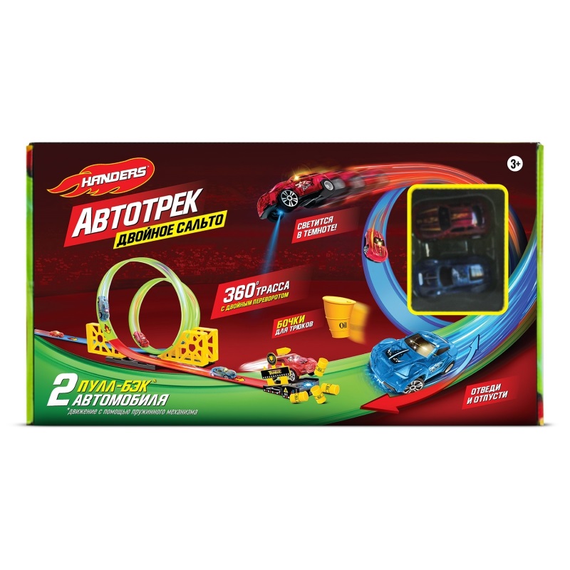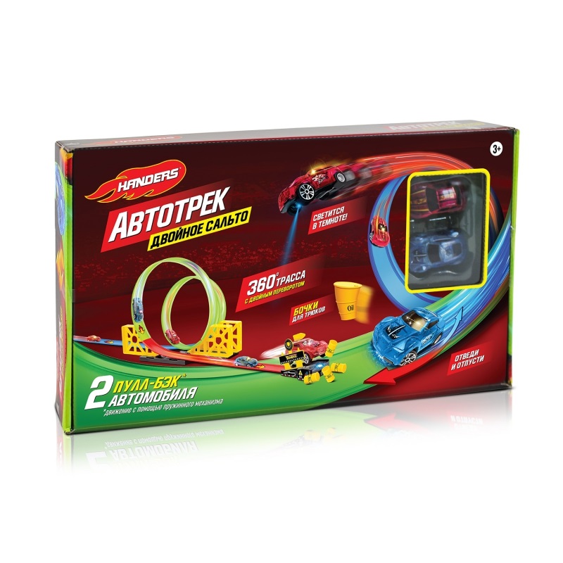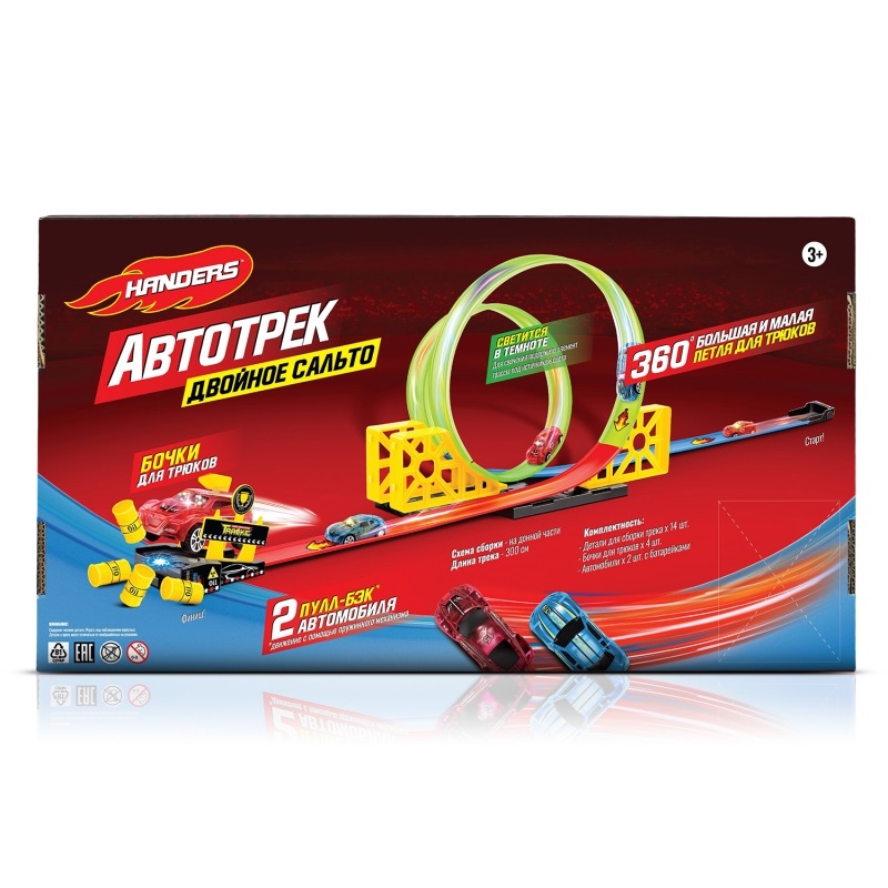 Игровой набор Handers "Автотрек: Двойное сальто" - это гоночная трасса с препятствиями (трюковые кольца, бочки для трюков). Автомобили приводятся в движение благодаря пружинному механизму - проверьте, справятся ли они со всеми препятствиями!