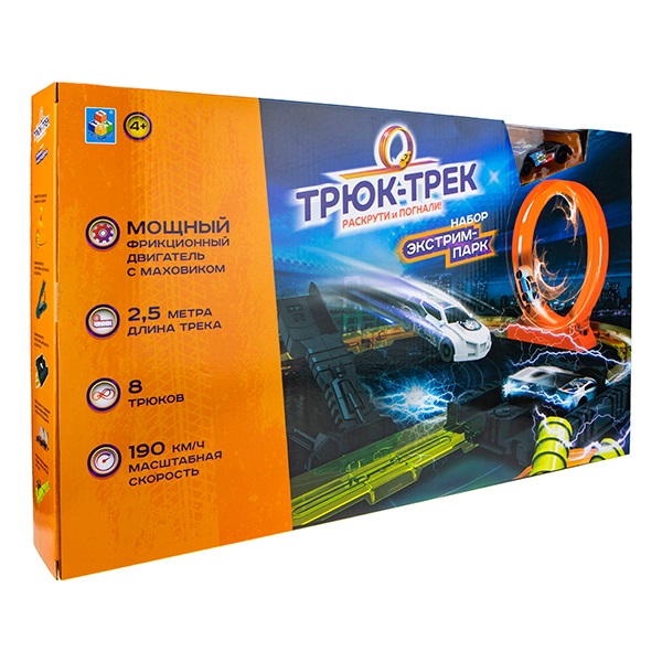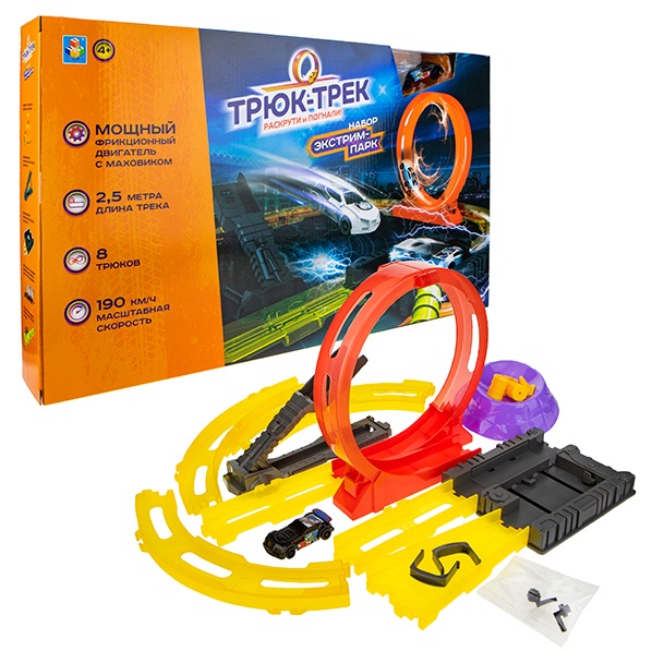 Набор Экстрим-парк с крутой трассой и гоночной машиной с заменяемым корпусом и фрикционным двигателем с маховиком. Собери машину, поставь на трассу и наблюдай, как она проходит препятствия. Может выполнять 8 трюков, развивает скорость 190 км/ч. Длина трека 2,5 метра.
