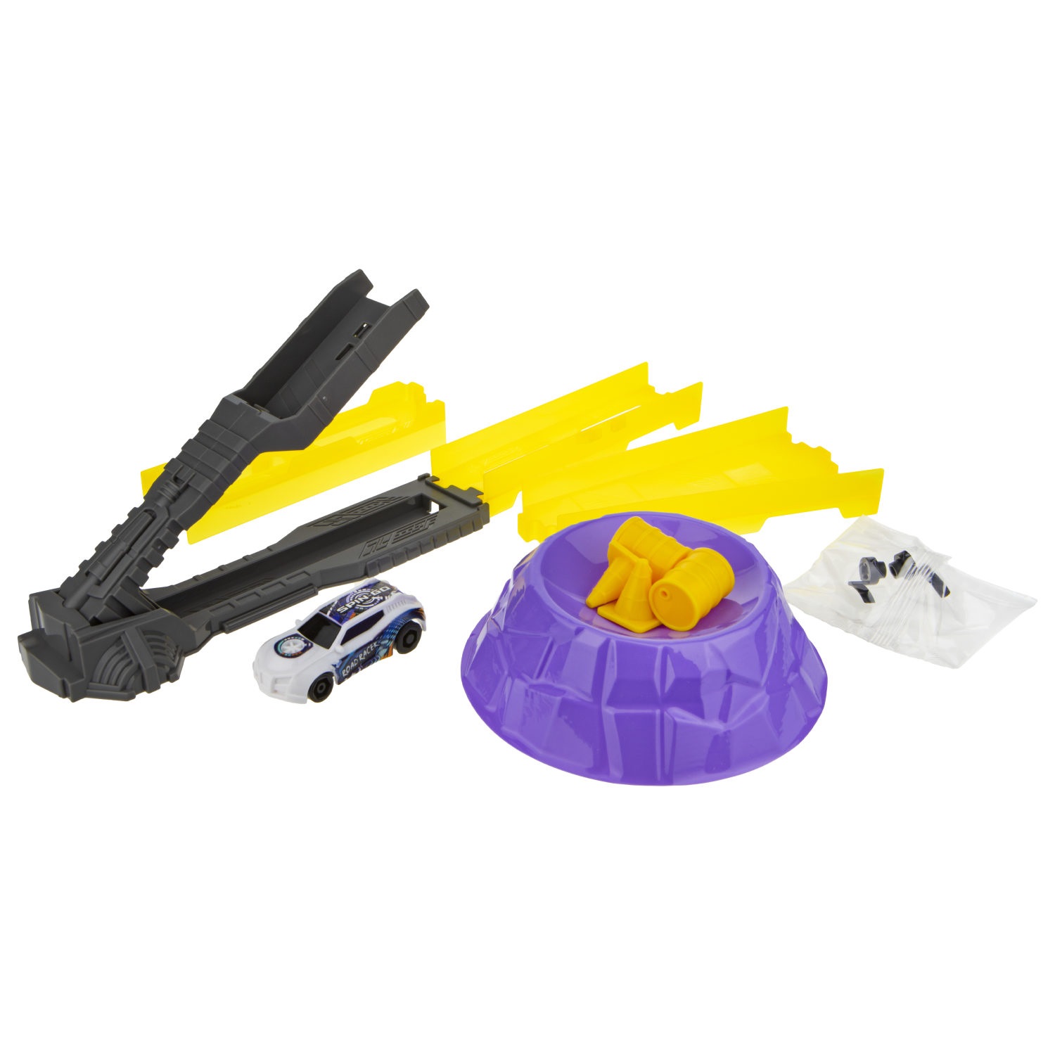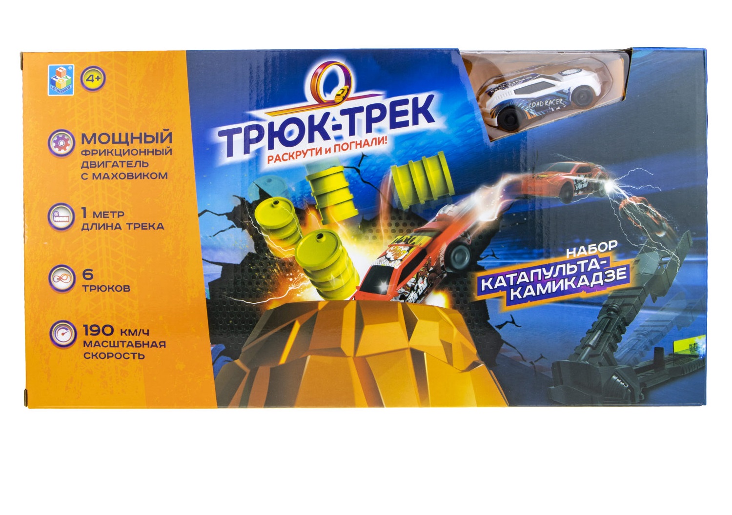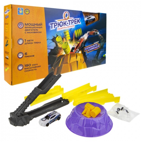 Набор Катапульта-камикадзе с крутой трассой и 1 гоночной машиной с заменяемым корпусом и фрикционным двигателем с маховиком. Собери машину, поставь на трассу и наблюдай, как она проходит препятствия. Можно выполнять 6 трюков. Развивает скорость 190 км/ч. Длина трека 1 метр.