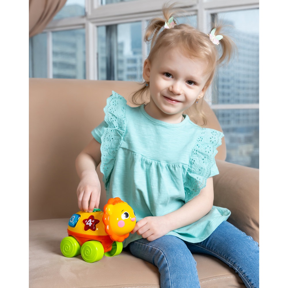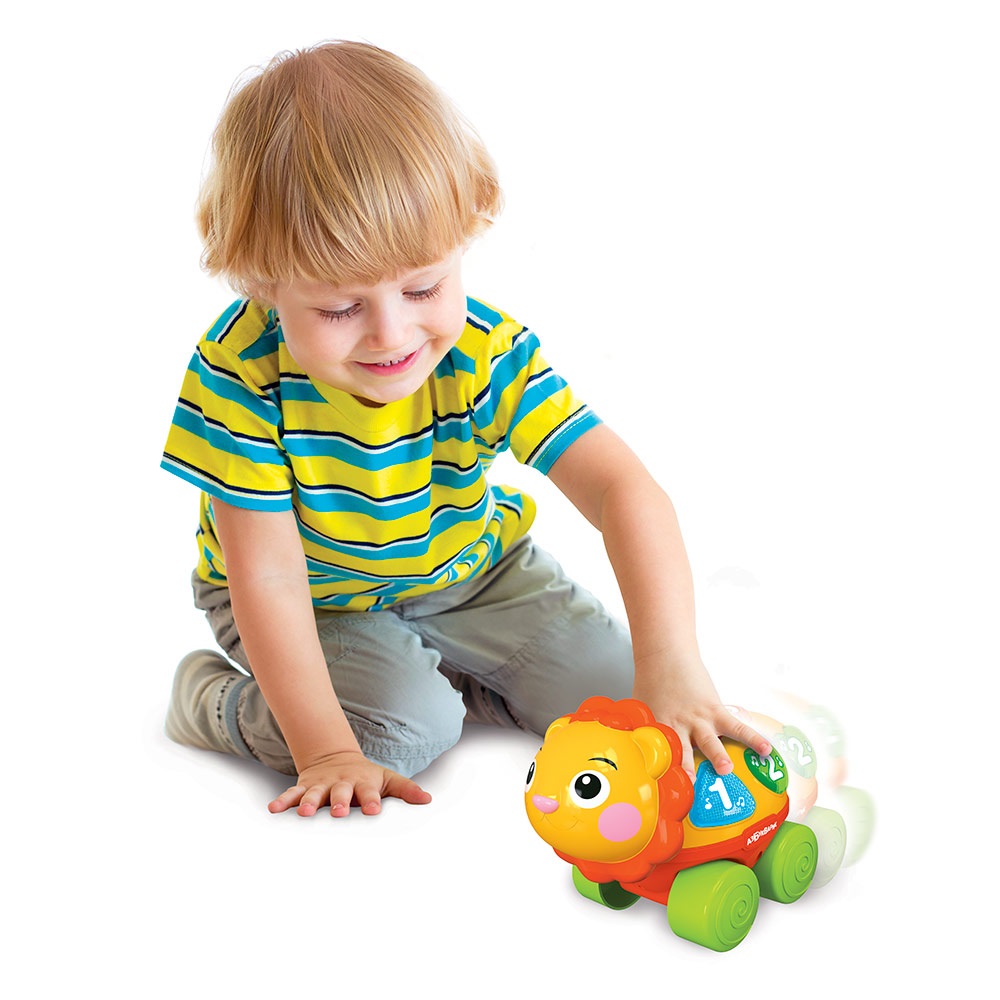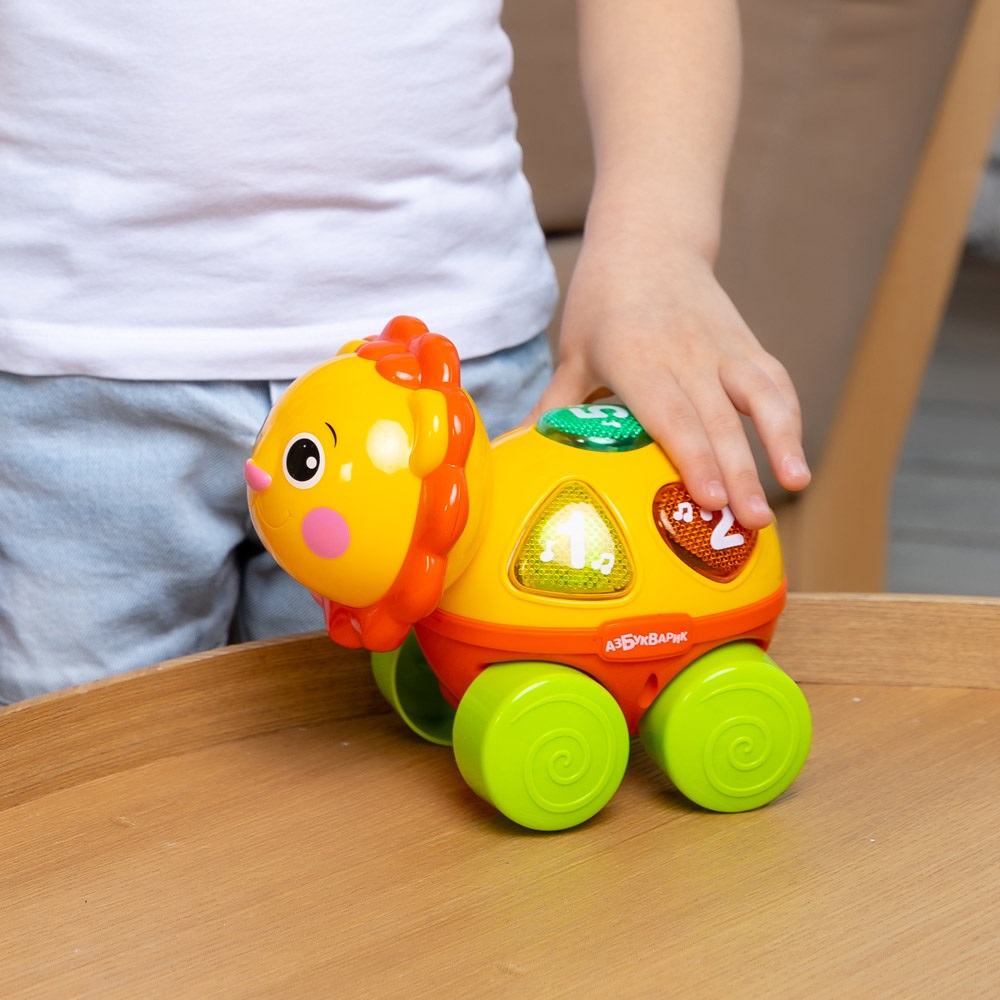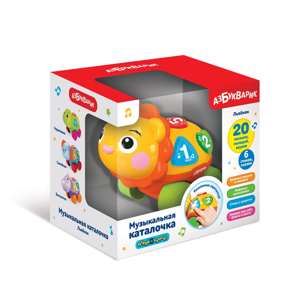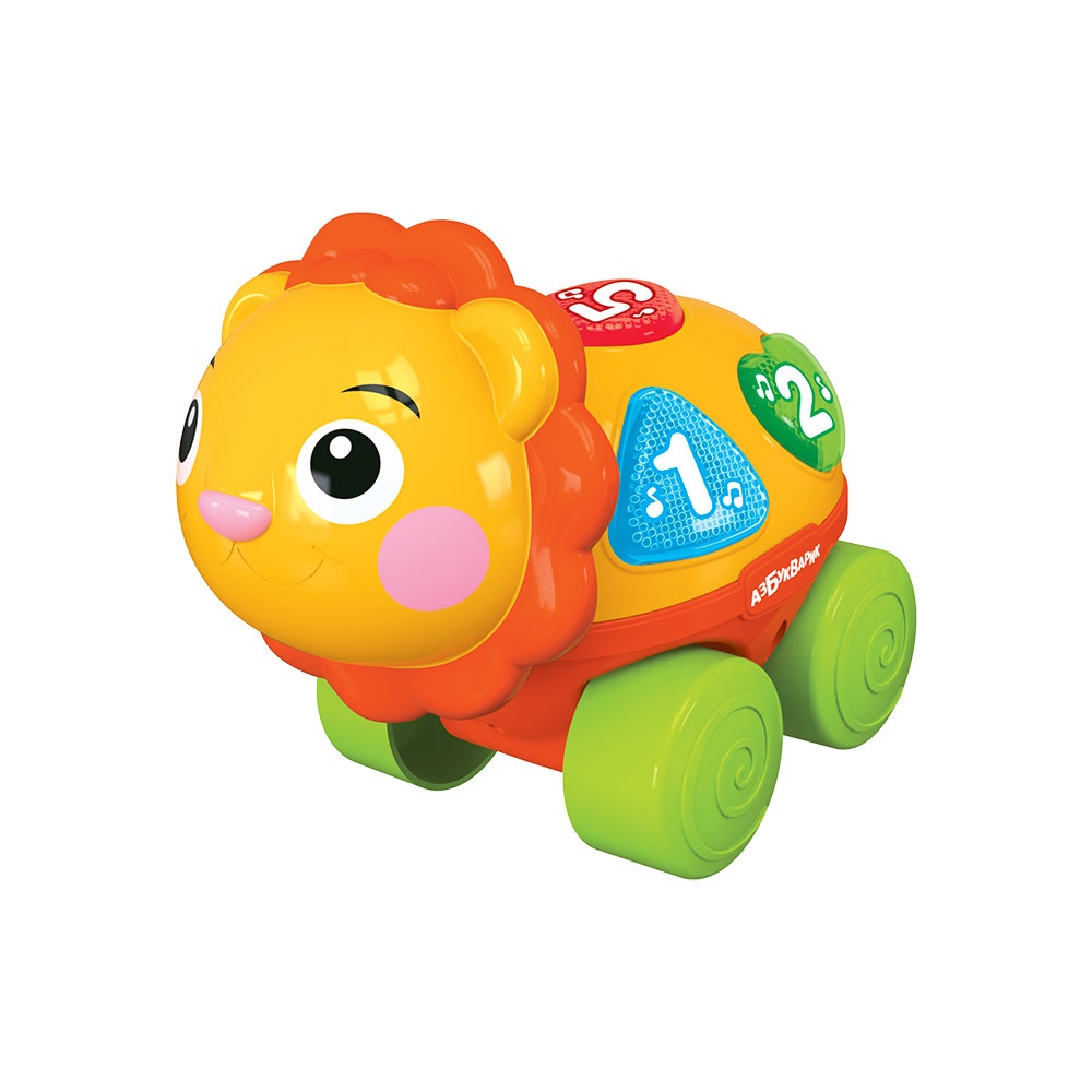 Малыш будет в восторге от своего нового друга на колесиках – львенка! На спине у него – разноцветные фигурные кнопочки с огоньками. Нажимая на кнопки, ребенок послушает любимые сказки со множеством забавных звуков(«Мама для Мамонтенка», «Марусина карусель»), обучающие песенки про счет, формы и цвета, хиты из мультиков, танцевальные мелодии и стихи о зверятах. И конечно, под музыку так весело катать львенка и бегать за ним!