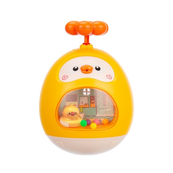 Если неваляшку толкнуть, она возвращается в исходное положение. Внутри корпуса находятся уточка и шарики, что создает еще и эффект погремушки.