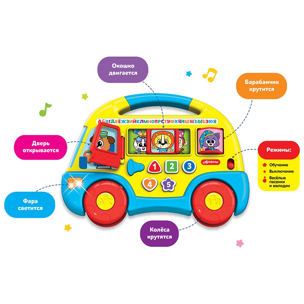 Автобус можно катать – колесики у него крутятся, а еще у него открывается дверь, двигается окошко, крутится окошко-барабанчик и светится фара!