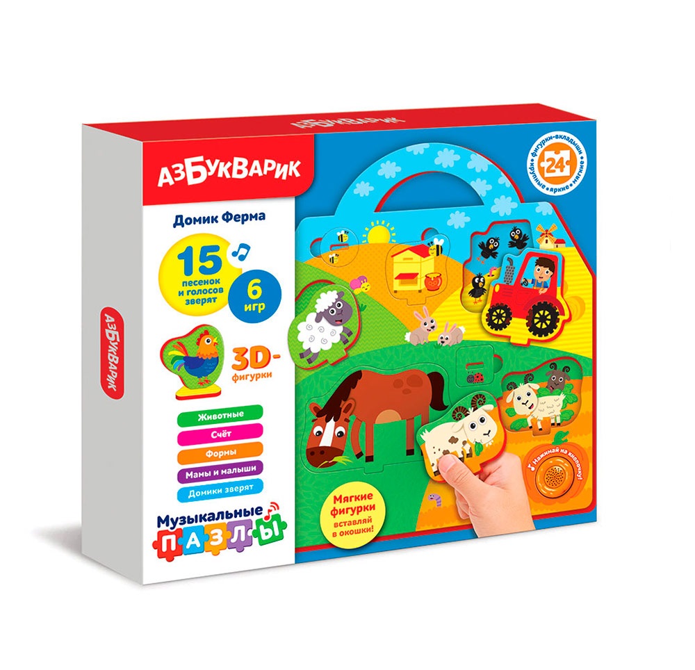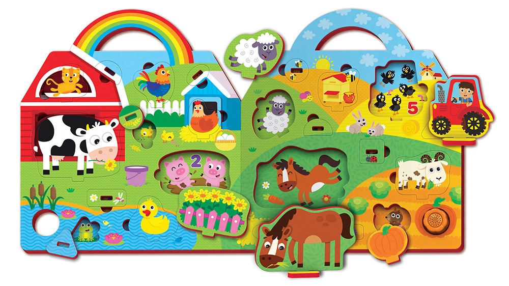 Вставляя мягкие фигурки в нужные окошки, малыш познакомится со зверюшками фермы, выучит цифры и формы. Родители могут поиграть вместе с ребенком в обучающие игры: «Считалочка», «Загадки про животных», «Логическая цепочка из фигурок» и др. Такие занятия развивают память, логическое мышление, мелкую моторику. Фигурки животных можно поставить на подставки – и разыграть настоящее театральное представление.