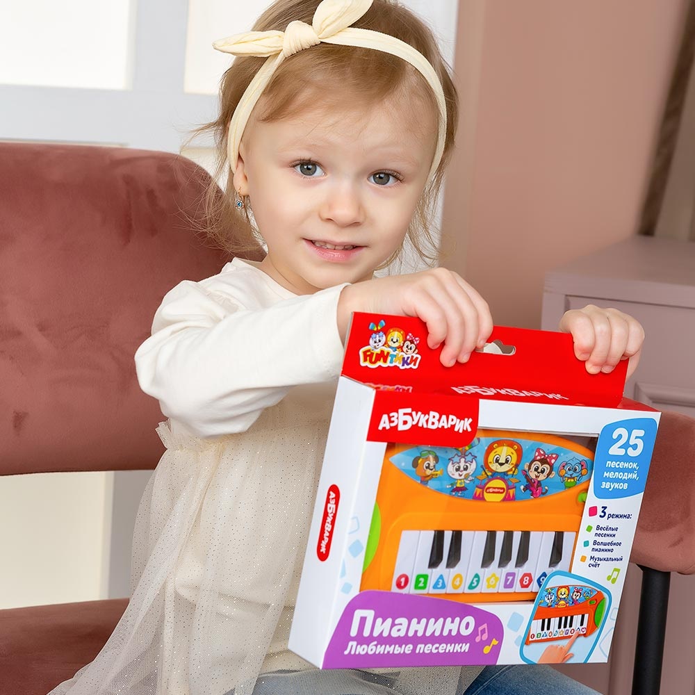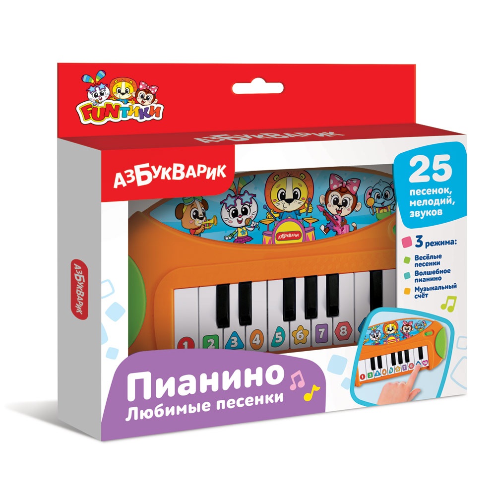 В режиме «Веселые песенки» ребенок послушает 10 детских хитов («Как чудесно жить на свете!», «Зарядка», «Вот как весело считать», «Бум-Бум», «Всё разноцветное вокруг», «Что такое праздник?» и др.). Режим «Музыкальный счет» – это самое оригинальное обучение счету! Малыш будет нажимать клавиши – петь по нотам и учить цифры.