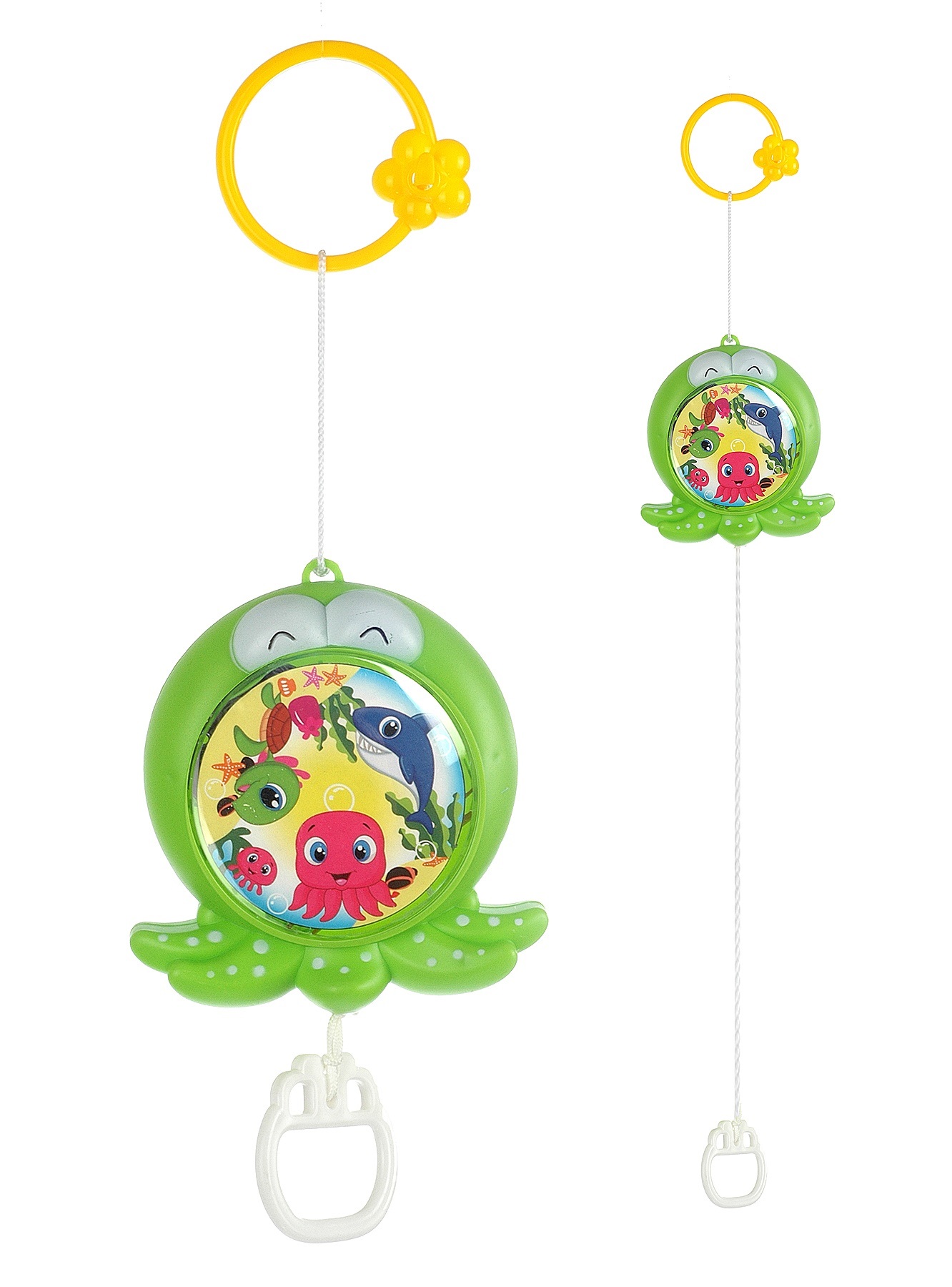 Игрушка работает на заводном механизме. Если потянуть за колечко на верёвочке, заиграет приятная колыбельная мелодия, а красочная картинка с мультяшными зверюшками начнёт вращаться.
