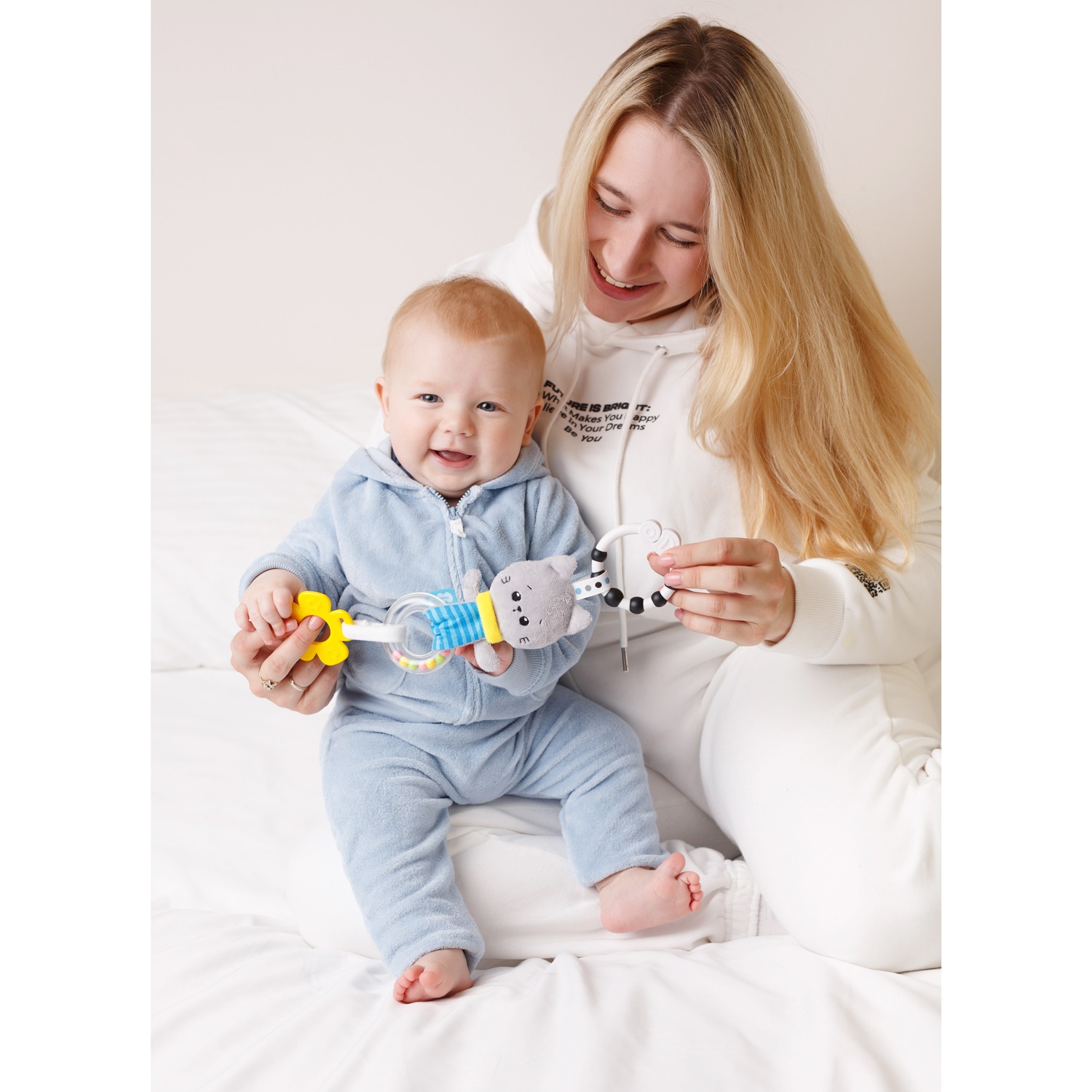 Игрушка имеет две погремушки, которые помогают в развитии внимания, а фигурный грызунок для детей позволяет справиться с неприятными ощущениями при прорезывании зубов. Игрушка-подвес изготовлена из высококачественных материалов, что делает ее полностью безопасной для игр. Крепление в виде кольца, позволяет прикрепить игрушку не только на детскую кроватку, но и на прогулочную коляску или детское автокресло.