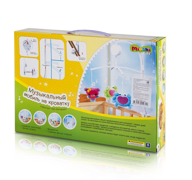 Музыкальный мобиль "Весёлая компания" прост в сборке и оснащен удобным креплением для игрушек. Все игрушки на мобиле съёмные, что делает его интересным для подрастающего малыша.