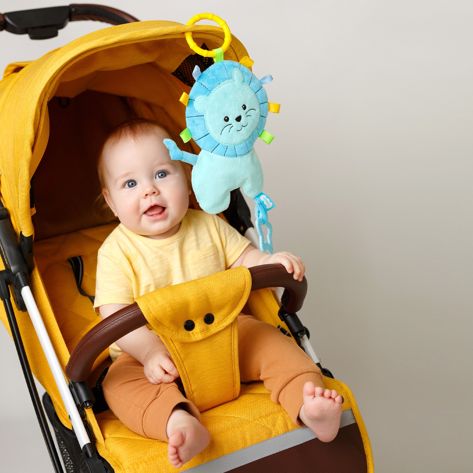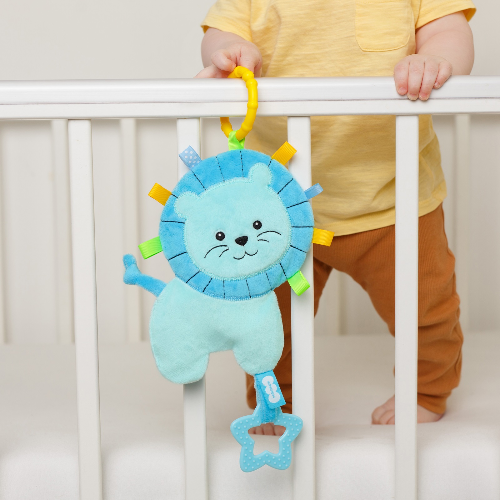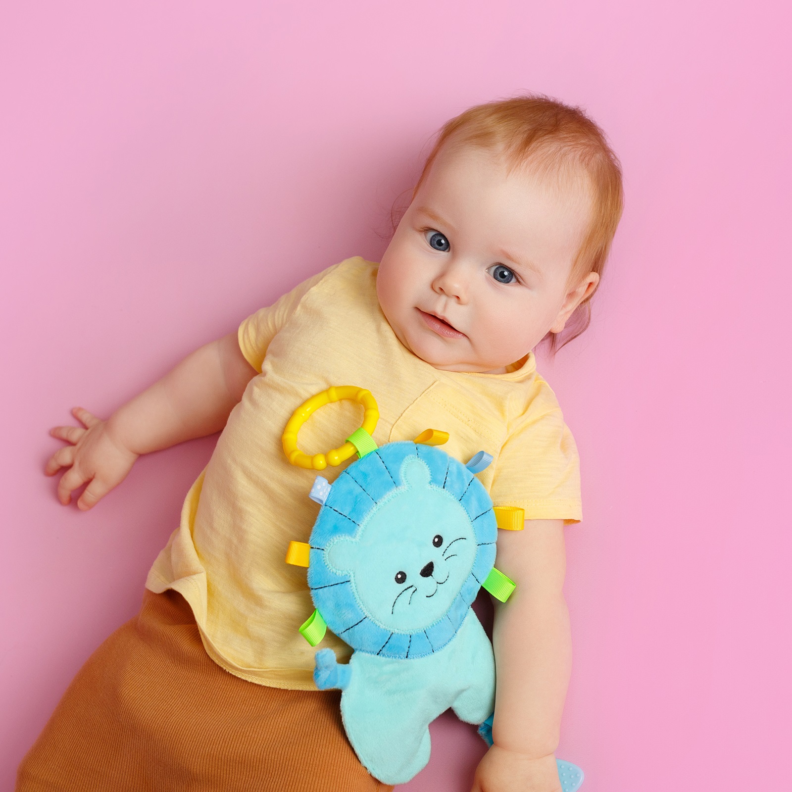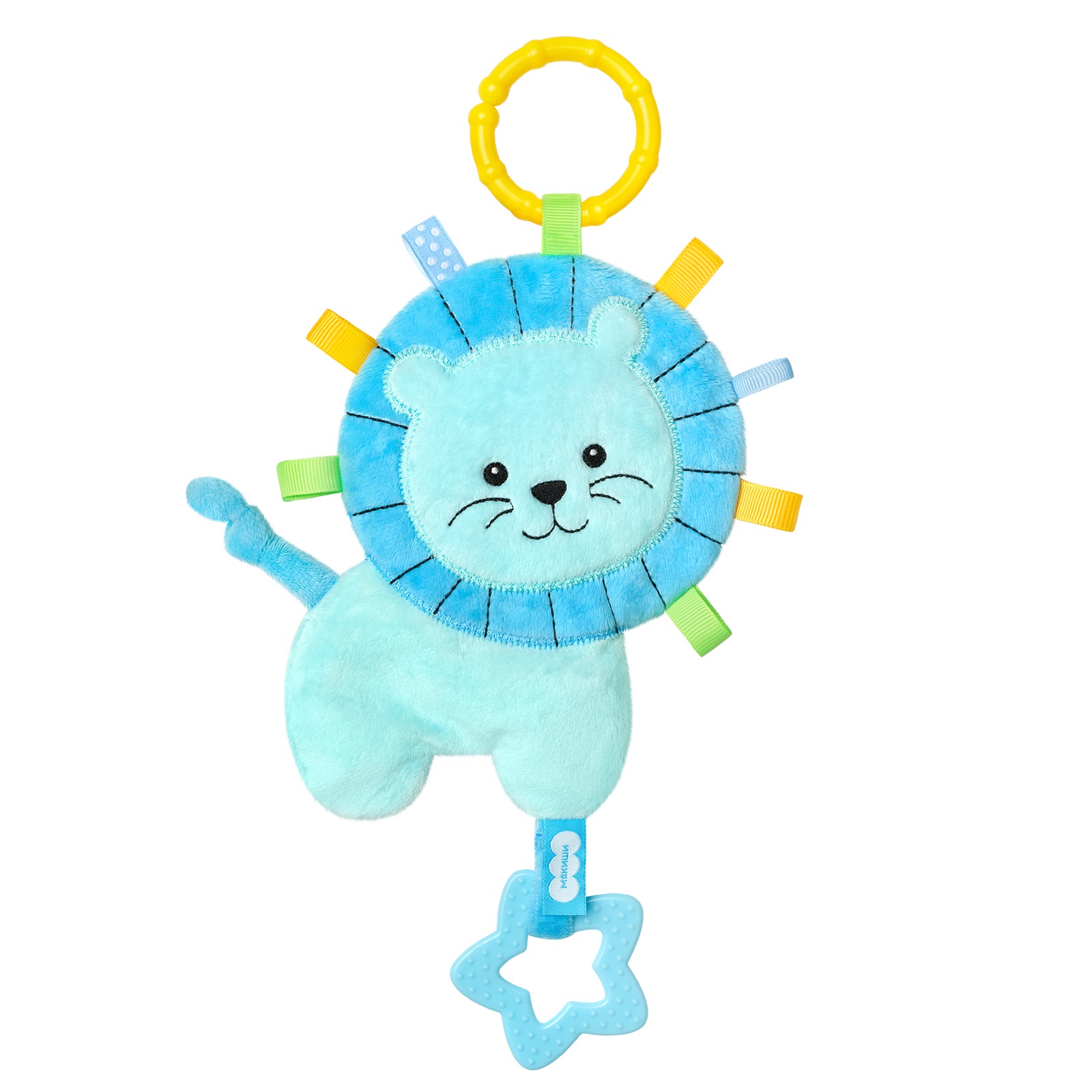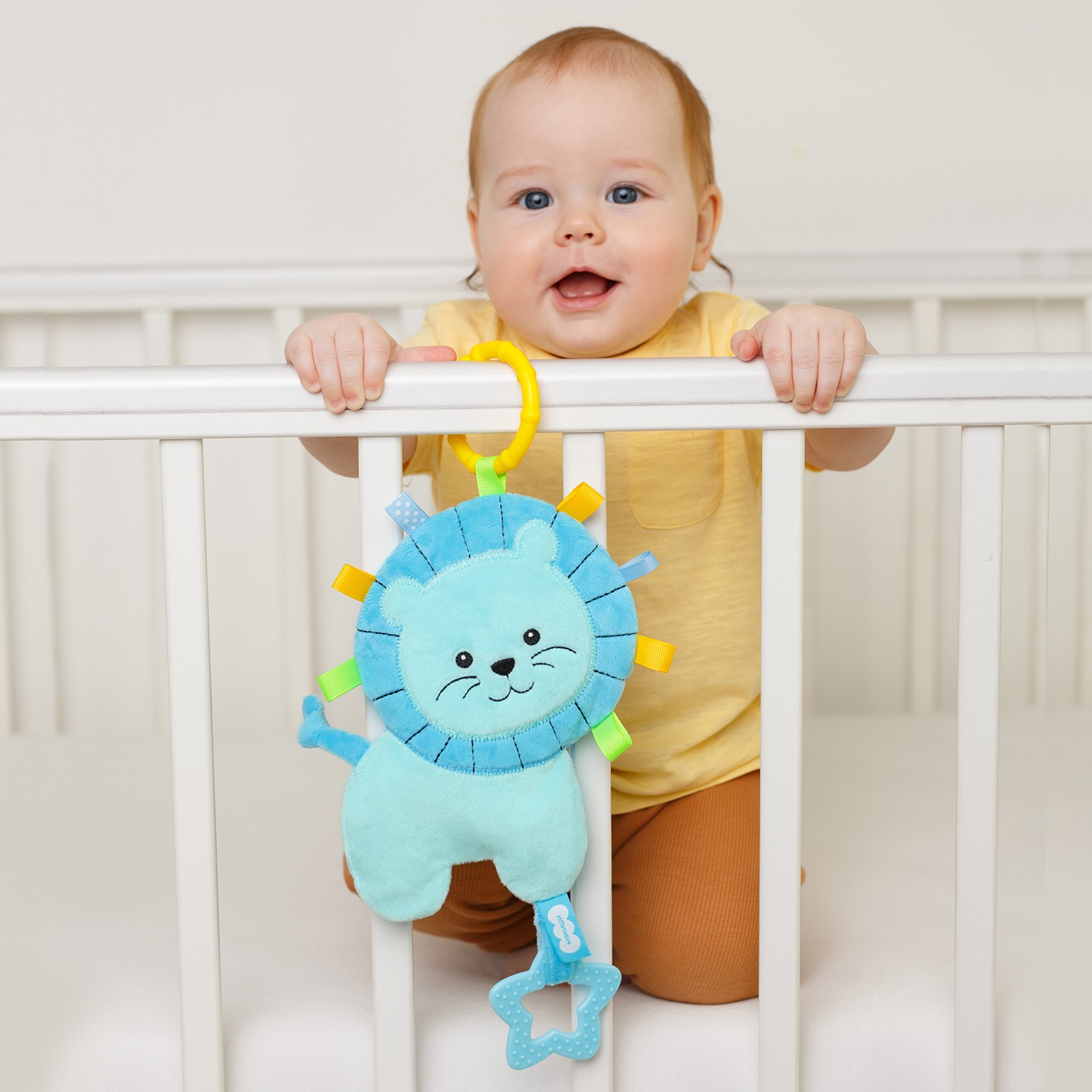 Занимательная мягкая развивающая подвеска игрушка голубой Лева с петельками станет первой любимой вещью для малыша. Ваш кроха будет с удовольствием шуршать и изучать не только образ короля животных, но и развивать тактильные ощущения, знакомясь с фактурой тканевых материалов, ведь это еще и шуршащая мягкая игрушка. Занятия с ярким хрустящим фигурным предметом способствует более раннему развитию мозга, остроты зрения и способности фокусироваться на предметах, развивает внимание, поле зрения, улучшает цветовосприятие и даже успокаивает ребенка в периоды перевозбуждения. Особенный интерес представляет грызунок-прорезыватель - его приятно погрызть, или просто потрогать пальчиками.