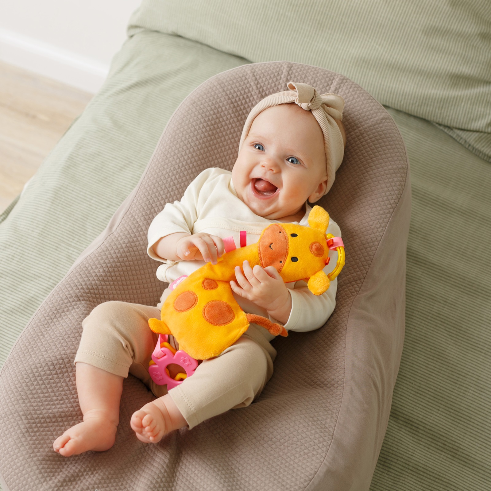 Занимательная мягкая развивающая игрушка подвеска оранжевый хрустящий Жираф с петельками станет первой любимой вещью для малыша. Ваш кроха будет с удовольствием шуршать и изучать не только образ животного, но и развивать тактильные ощущения, знакомясь с фактурой тканевых материалов, ведь это еще и шуршащая мягкая игрушка. Занятия с ярким фигурным предметом - как развивашки для детей - способствуют более раннему развитию мозга, остроты зрения и способности фокусироваться на предметах, развивает внимание, поле зрения, улучшает цветовосприятие и даже успокаивает ребенка в периоды перевозбуждения.