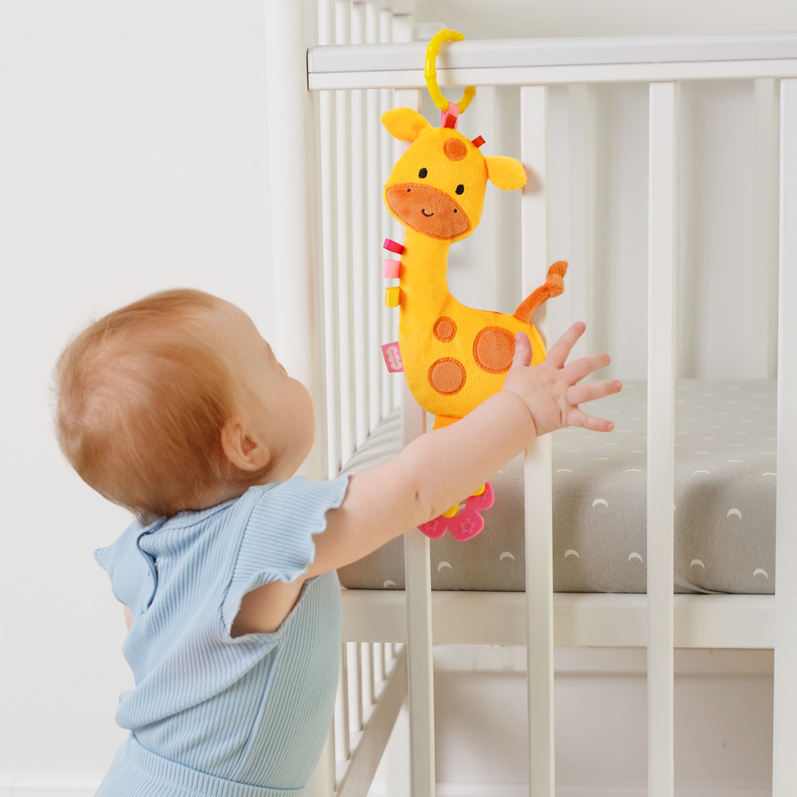 Особенный интерес представляет грызунок-прорезыватель - его приятно погрызть, или просто потрогать пальчиками. Грызунок отлично снимает зуд при прорезывании зубов. Благодаря разъемному колечку погремушку удобно повесить на коляску, автокресло, кроватку. Многофункциональная игрушка антистресс развивает зрение и слух, воображение малыша, тактильность и надолго концентрирует его внимание. Жираф с одной стороны выполнен из меха с коротким ворсом, с другой - из гладкой ткани, которая очень отличается от меха на ощупь.