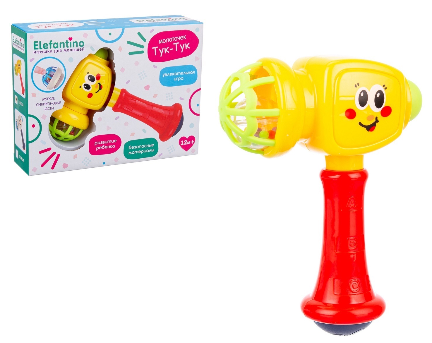 Молоточек–погремушка с забавной мордашкой на корпусе станет не