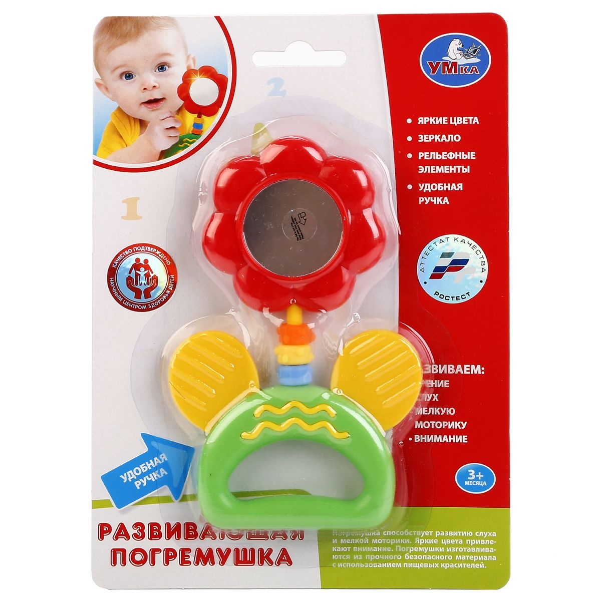 Развивающая погремушка "Цветок с зеркалом" станет настоящим развлечением для малыша. Она выполнена из безопасного материала и окрашена в разные цвета. Снизу есть удобная ручка, за которую можно держать погремушку маленькими пальчиками. Сверху находится цветок с серединкой в виде зеркала. По всей поверхности находятся рельефные элементы. Игрушка способствует развитию тактильных навыков, мелкой моторики, слуха, внимания. Рекомендуется малышам от 3 месяцев.