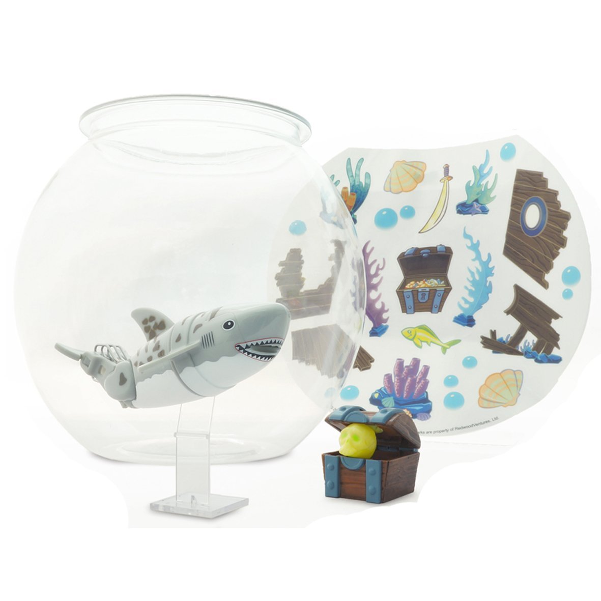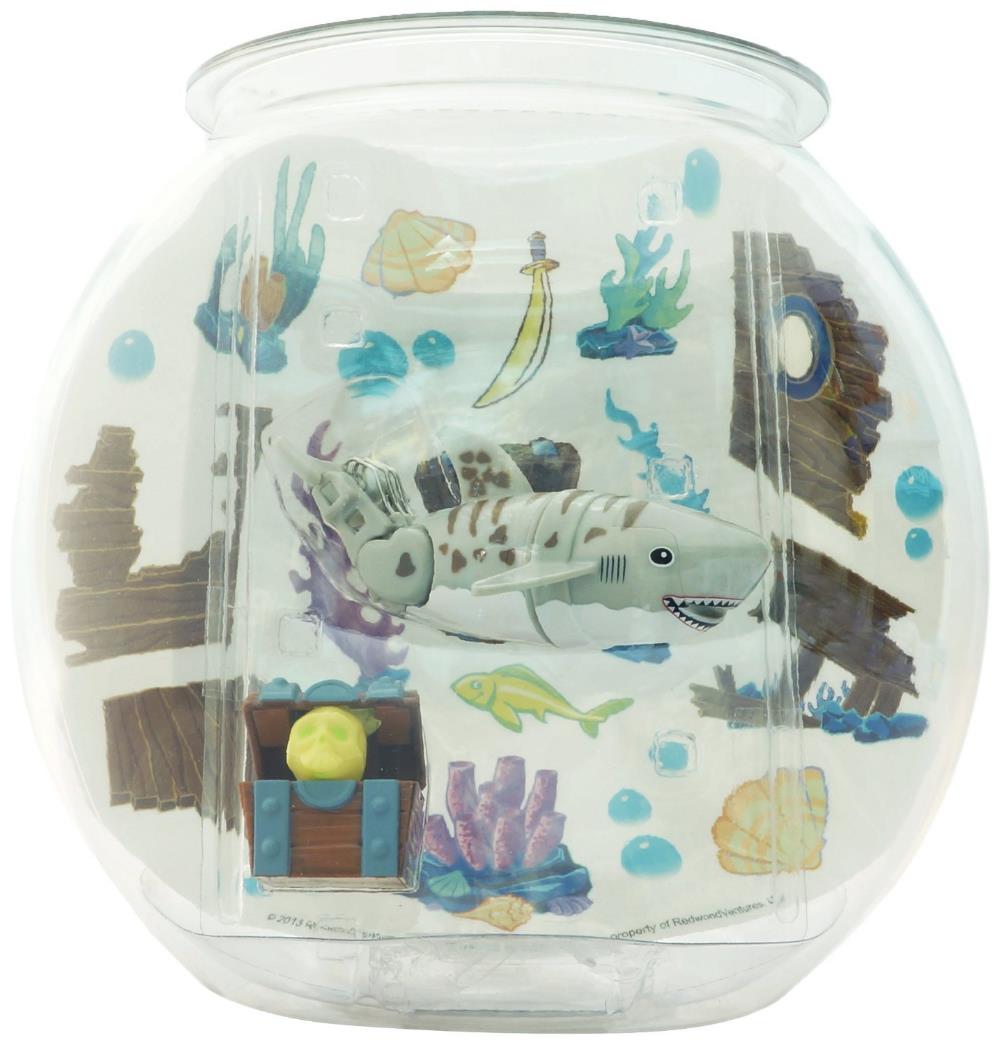 В комплект входит акула, аквариум на 5 литров, сундучок и череп, который в нем хранится. А еще ребенок сможет красочно обустроить «домик» своего питомца, ведь в набор входят наклейки.