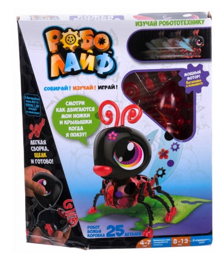 - Набор, состоящий из 25 ярких пластиковых деталей, позволяет детям собрать интерактивного робота в виде Божьей коровки.
