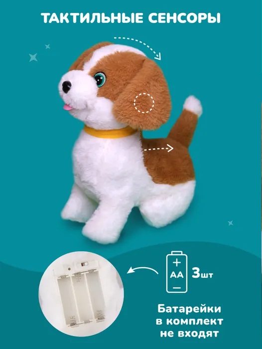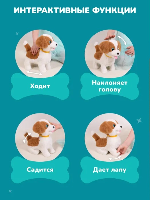 Погладьте его по спинке, и он начнет ходить и лаять. Погладьте его по голове, и он наклонит ее, высунет язычок и будет скулить. А если вы нажмете на ушко, то милый песик начнет вилять хвостиком, сядет и даст лапку!