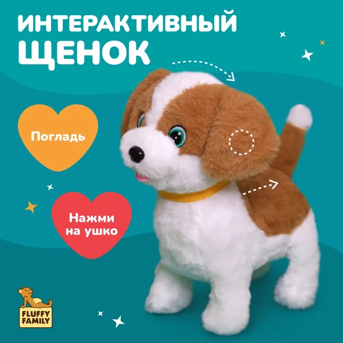 Интерактивный «Послушный щенок» ТМ Fluffy Family со встроенным тактильным сенсором может наклонять голову и высовывать язычок, ходить, скулить и лаять, садиться и вилять хвостом, а еще давать лапку! Все эти команды милый щенок выполняет самостоятельно, стоит только погладить его.