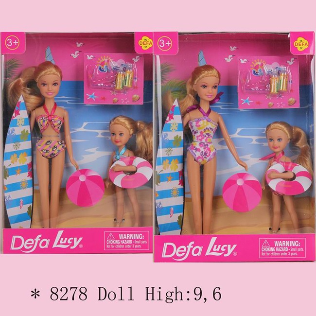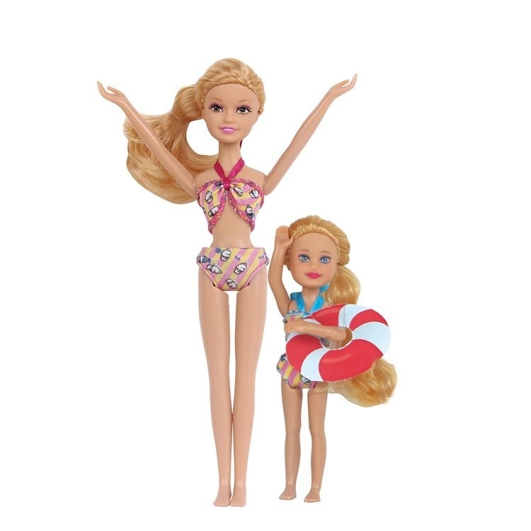 В наборе: две куклы и дополнительные картонные элементы (круг, доска для сёрфинга).