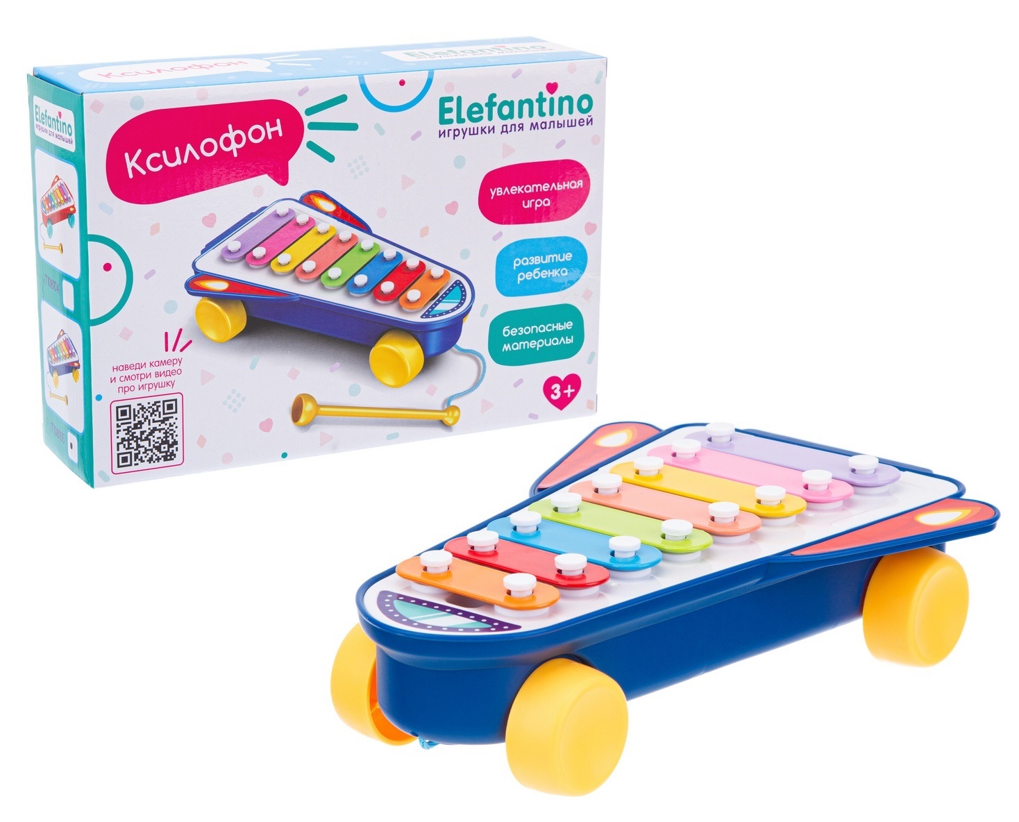 Клавиши у ксилофона металлические разноцветные, корпус из пластика.