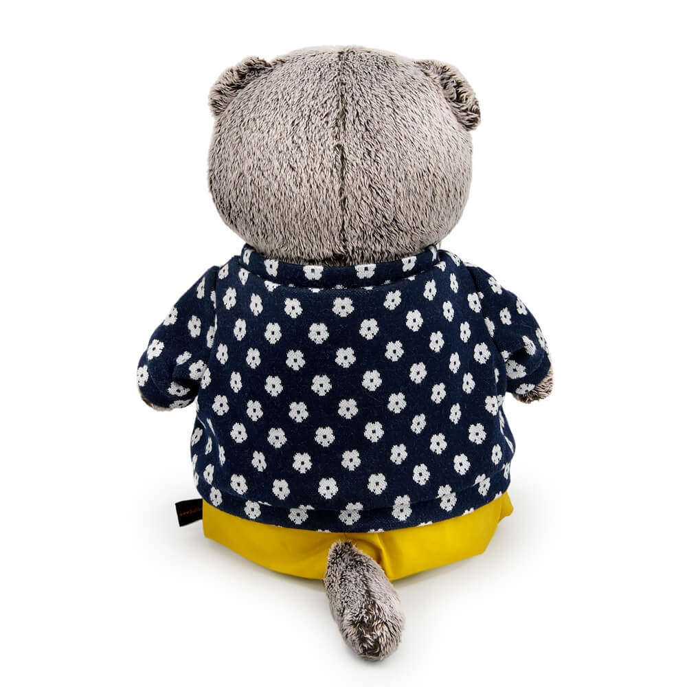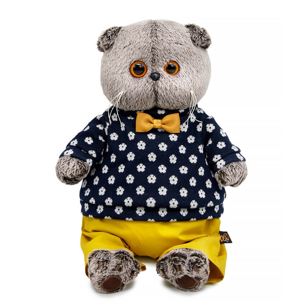 Басик в шикарном джемпере из чёрного жаккардового трикотажа в белый цветочек. Широкие штанишки цвета светлой горчицы очень эффектно дополняют джемпер. На шее Басика небольшой атласный бантик цвета античного золота
