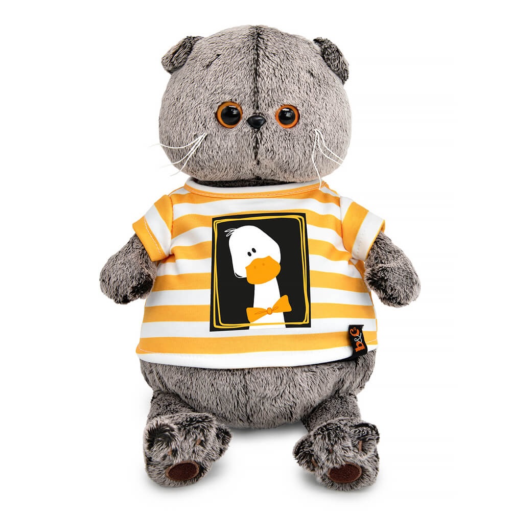 Басик в футболке "Гусик" Размер—22 cm Кот Басик в классной футболке из х/б трикотажа в бело-жёлтую широкую полоску. Спереди на футболке авторский принт с Гусиком.