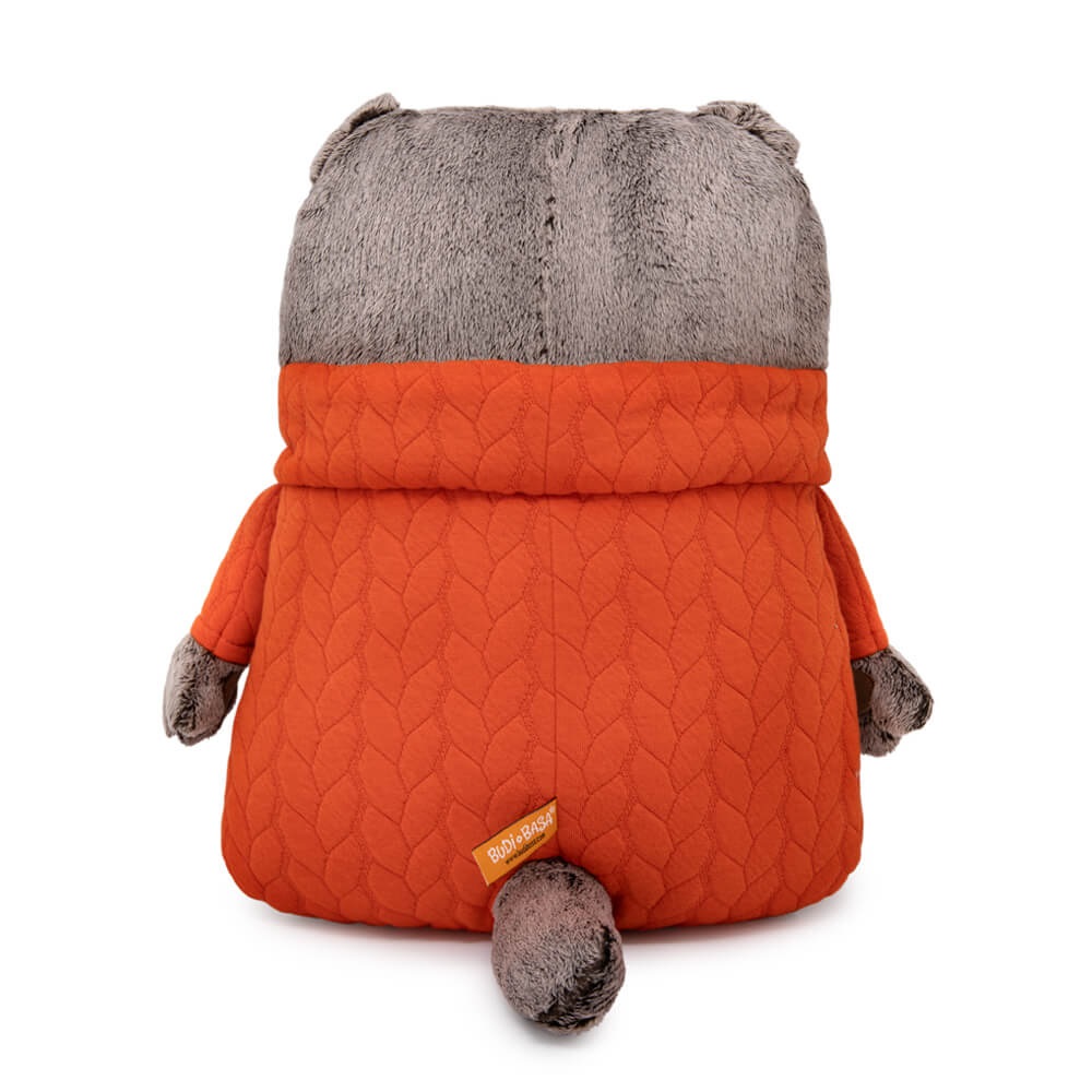 Необычная подушка кот Басик из оригинального меха с вышитой мордочкой. На коте-подушке вшит интересный свитер с высоким воротником стойка. Оранжевый свитер из плотной мягкой ткани с выработкой под вязку косами. Внизу на подушке пришит фирменный логотип.