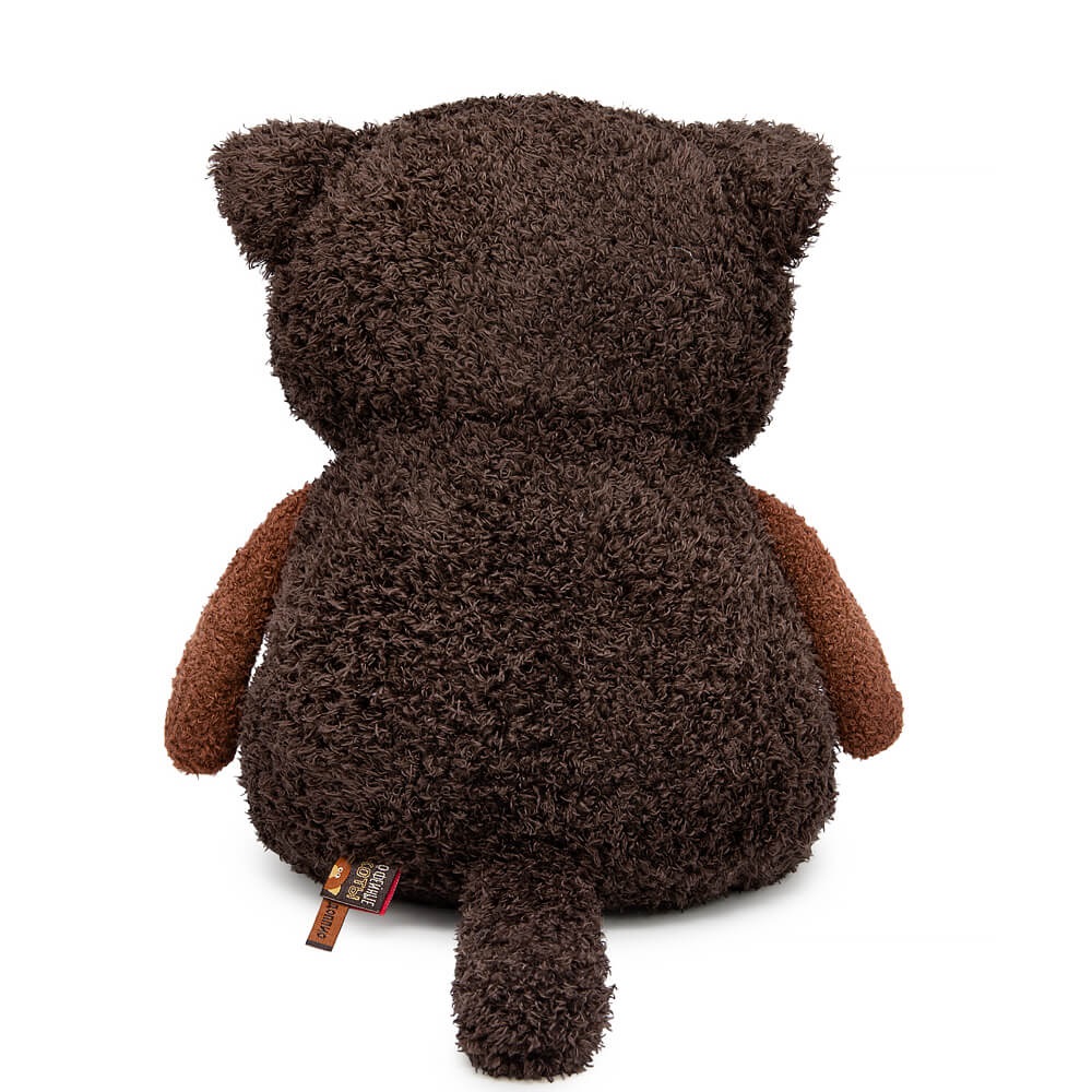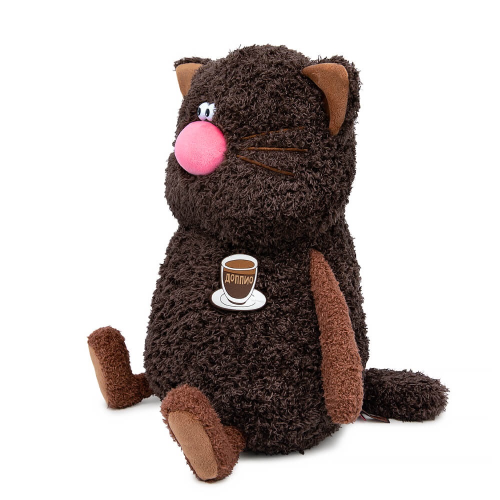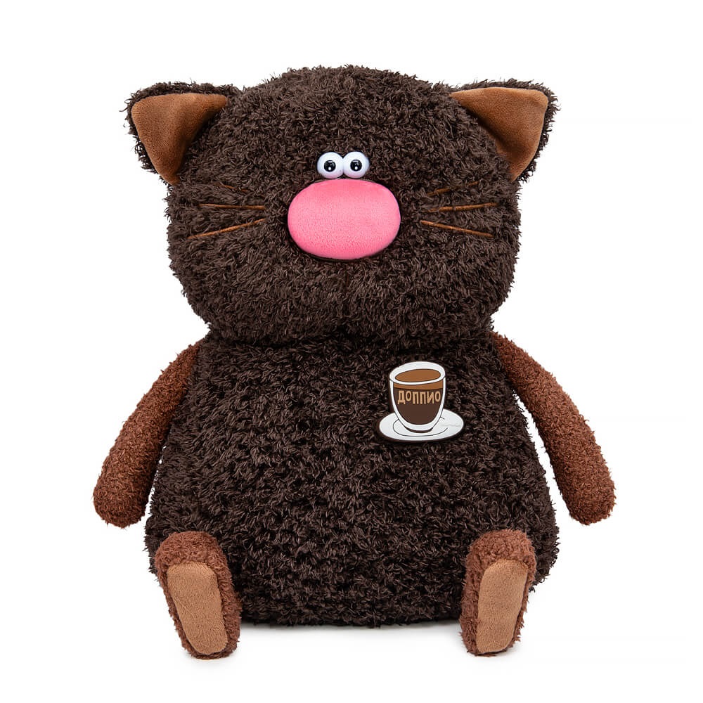 Классный кот?подушка Доппио из тактильно приятного эко меха цвета горького шоколада. Лапки из более короткого меха цвета кофе. Усики из шелковистого крученого шнура. Объемный носик обтянут розовым софтом. Глазки из пластика. На пяточках и внутри ушек вшит медно?коричневый софт. Спереди кота?подушку украшает силиконовый подвес в виде чашечки с кофе доппио.