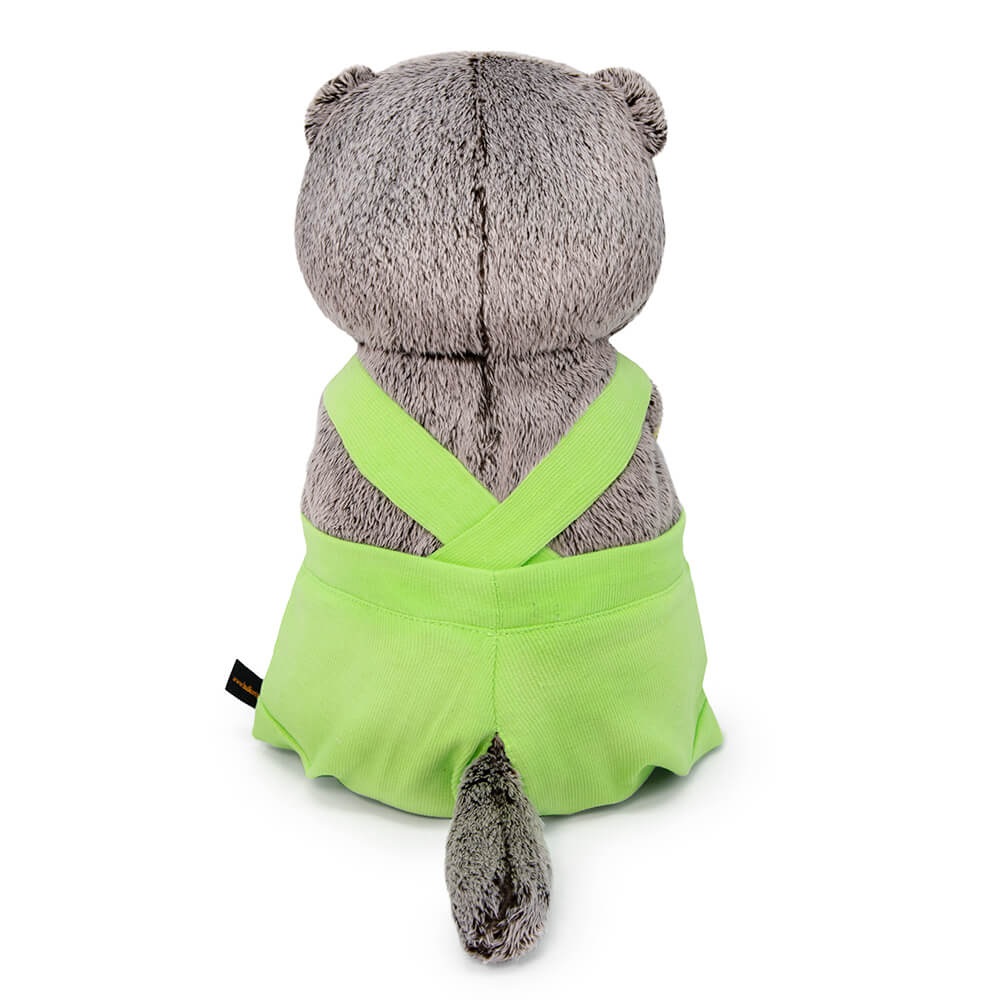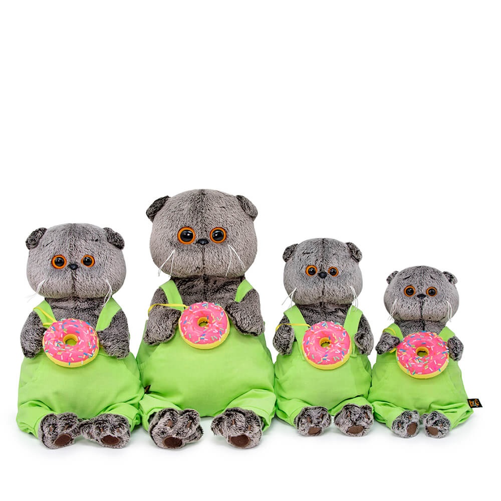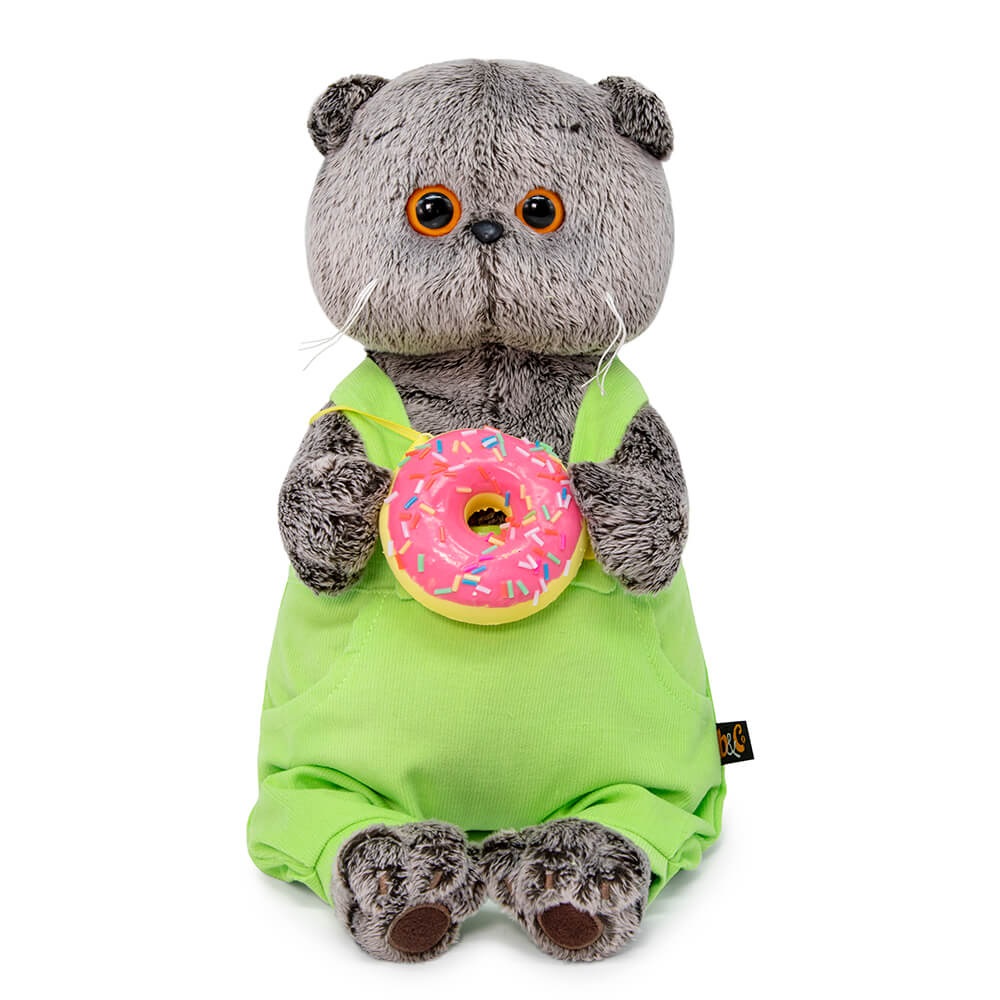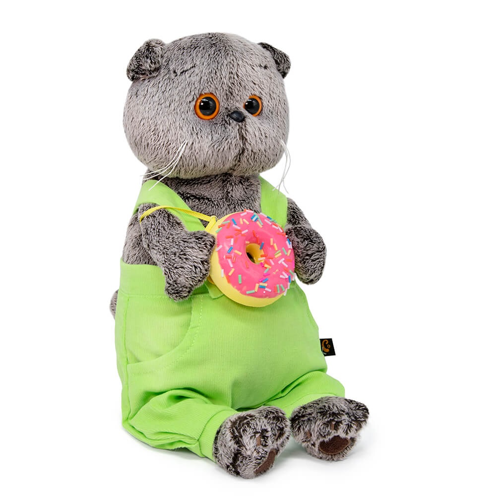 Кот в комбинезоне из микровельвета цвета свежего салата. В лапках Басик держит интересный аксессуар?антистресс в виде аппетитного пончика.