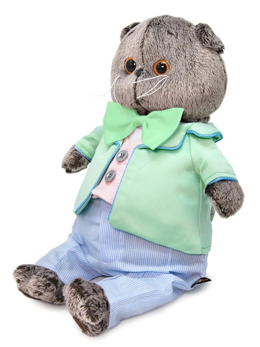 Кот Басик от БУДИ БАСА в невероятно модном и дорогом комплекте в пастельных тонах. Пиджак из плотного х/б сатина мятного цвета с голубым кантом. Жилет цвета розовой воды с люрексом на серебристых пуговках. Элегантные х/б брючки в бело-голубую полоску. Белая футболочка из х/б трикотажа. Также в комплекте объемный галстук-бабочка. Одежду и аксессуары можно снимать. Продается в стильной подарочной коробке с атласными лентами, собранными в нарядный бант. Лучший подарок для тех, кто любит котиков и не готов с ними расставаться. Игрушка поставляется в фирменном коробе, защищающем подарочную упаковку. Гарантируем оригинальность продукта, его высокое качество и привлекательную цену благодаря эксклюзивному договору с производителем и отгрузке напрямую со склада. Шотландский вислоухий кот Басик с мягкой плюшевой шерсткой серебристо-лилового цвета, выразительными медовыми глазами и коротким хвостиком.