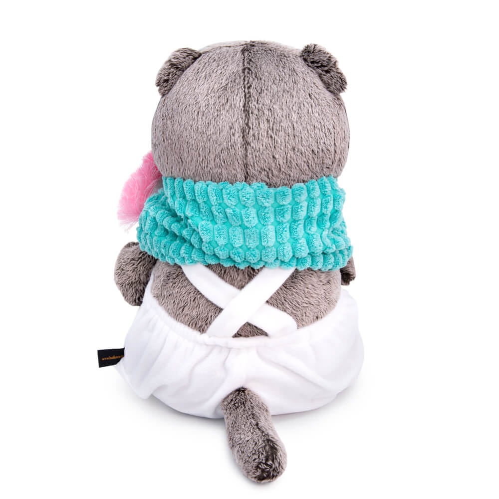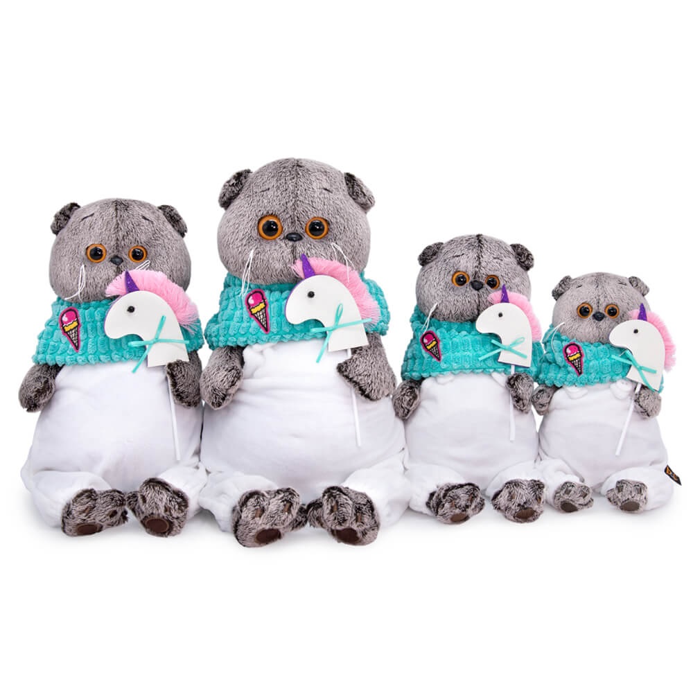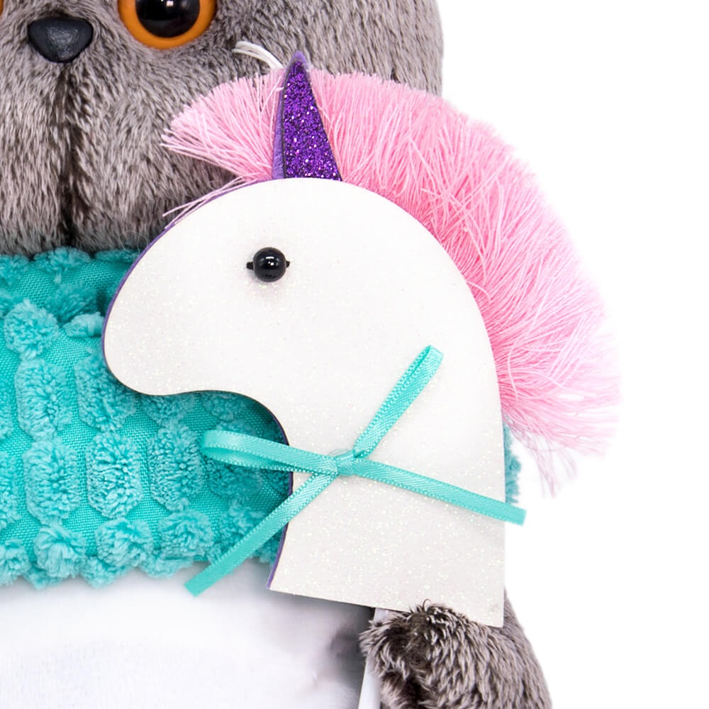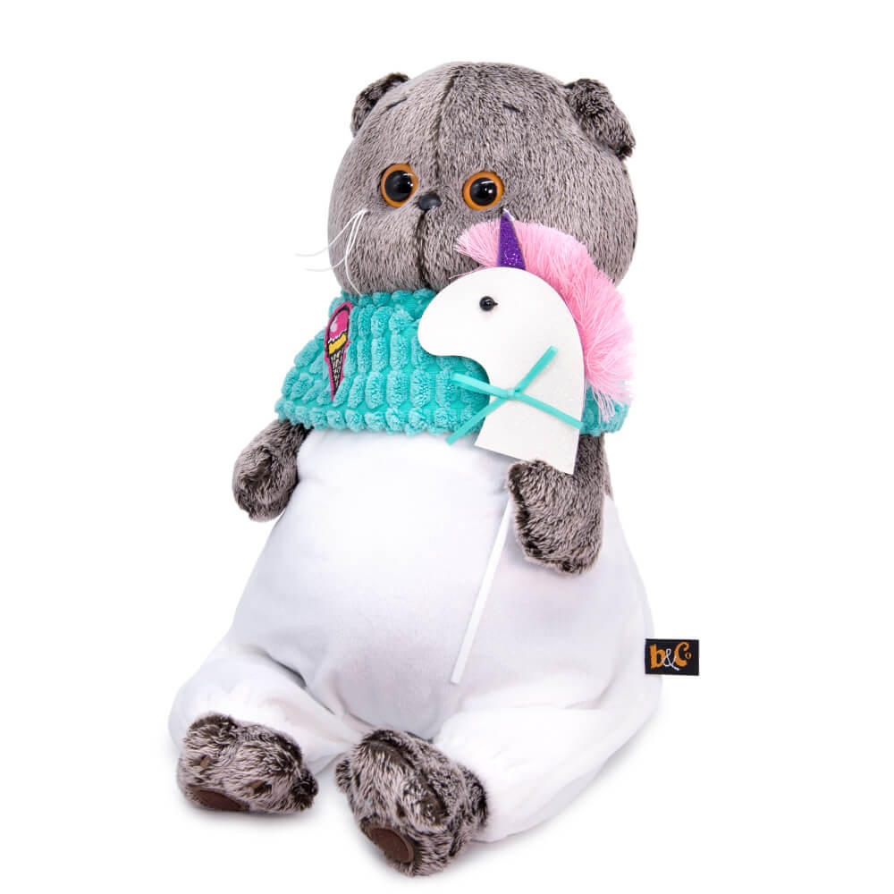 Кот в комбинезоне из белоснежного софта и снуде из бирюзового крупноячеистого вельвета. Снуд украшен нашивкой в виде мороженого. В лапках Басик держит единорога на палочке, выполненного вручную из фетра с атласным бантиком.