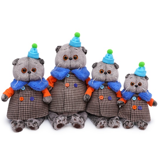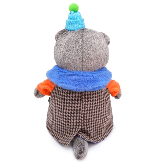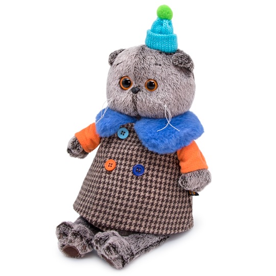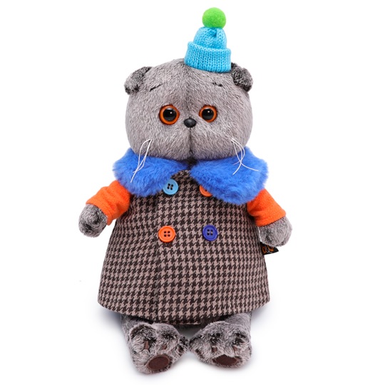 Кот в забавном комбинированном пальто с ярко-оранжевыми рукавами, ярко-голубым меховым воротником и разными по цвету пуговками. На голове у Басика маленькая вязаная голубенькая шапочка с маленьким помпоном.
