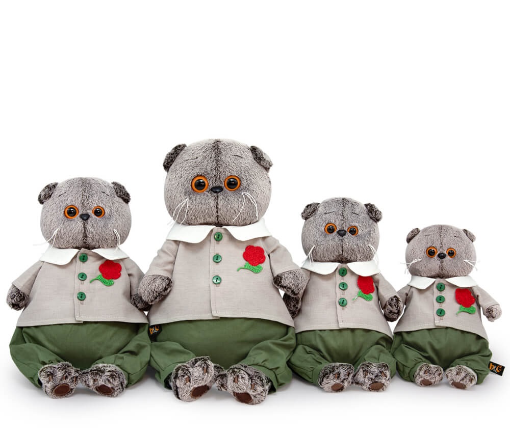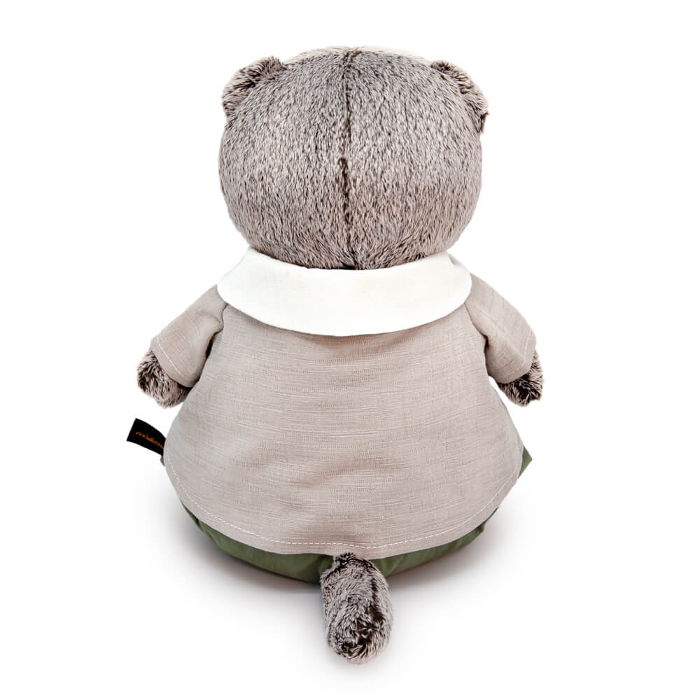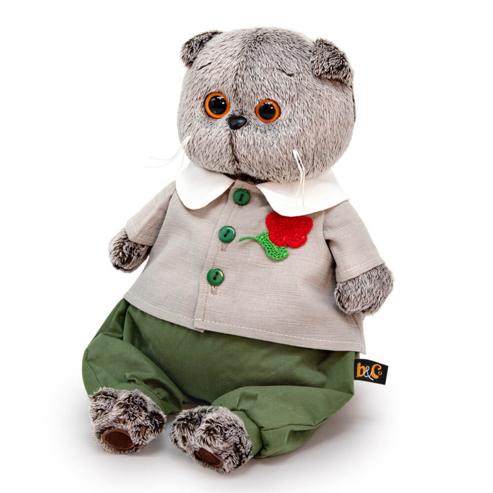 Басик в очень милом костюмчике. Рубашка красивого сложного оттенка с отложным белоснежным воротничком, на зеленых пуговках спереди. Украшена вышитым алым цветком. Также на Басике широкие х/б штанишки плотного елового цвета.