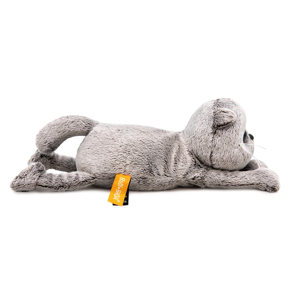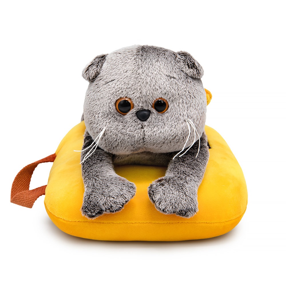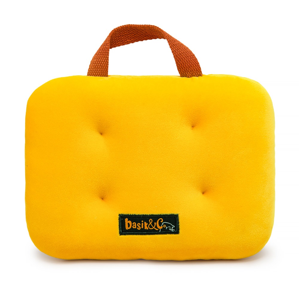 Кот Басик лежит на животике, уютно вытянув лапки, на мягкой оранжевой подушечке. На шее Басика бантик из мягкого софта золотисто-охристого цвета. Подушка сшита из софта с фирменным логотипом и ручкой из текстильной ременной стропы цвета корицы.