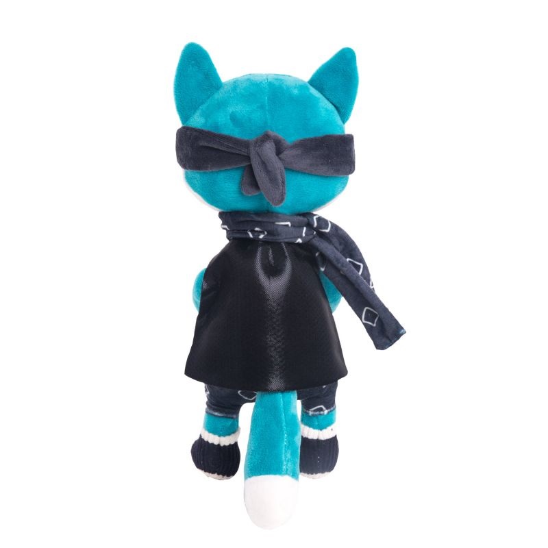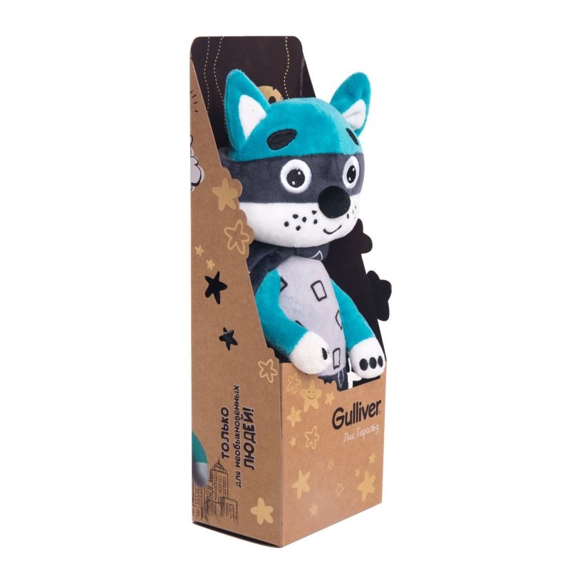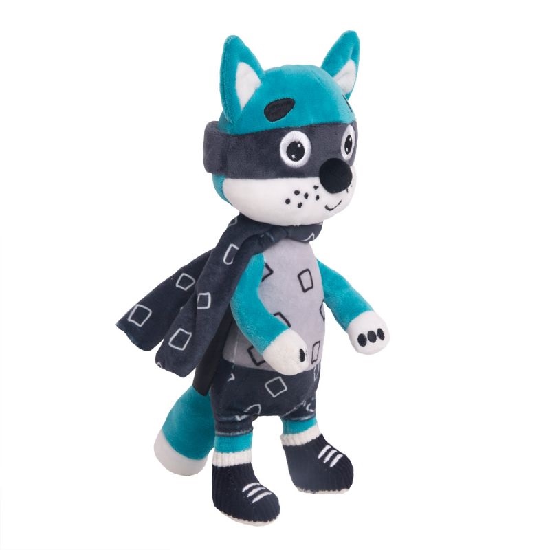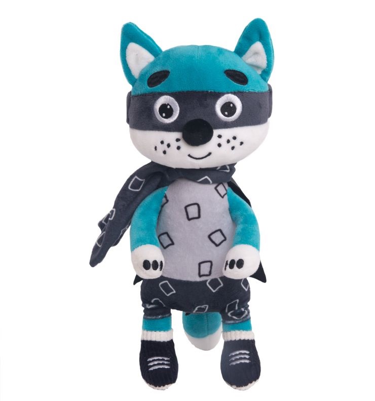 - Игрушка выполнена преимущественно в бирюзовом цвете, у лиса белый животик, прошитая мордашка, а также торчащие ушки и хвост. Лис одет в костюм супергероя, состоящий из черных шорт, маски и плаща.
